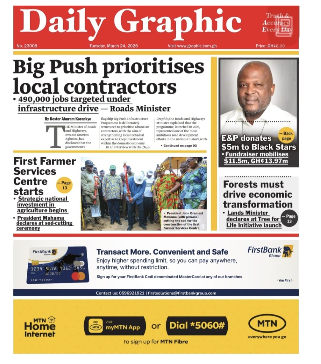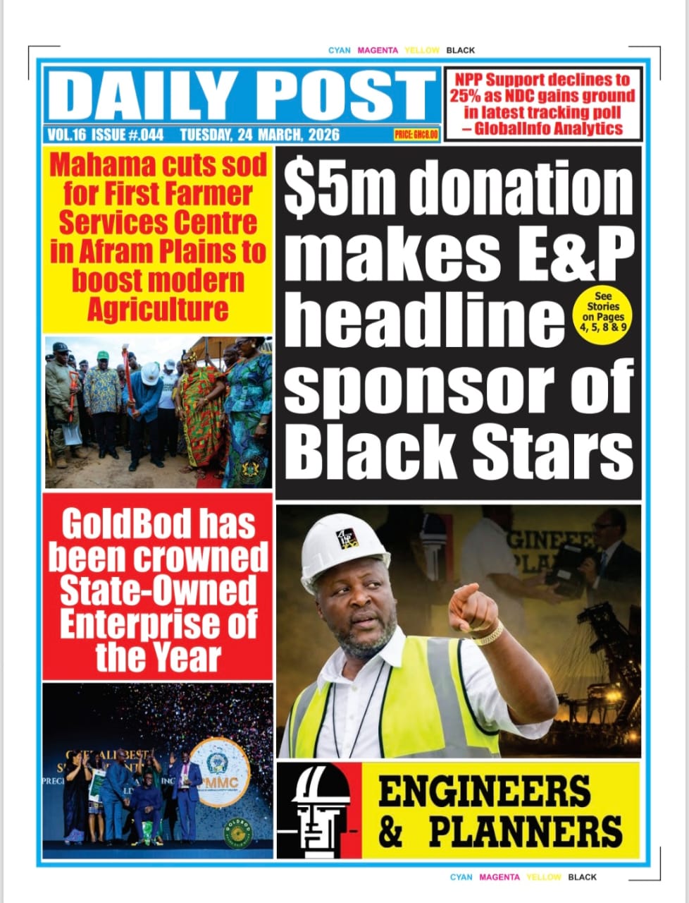 Newspaper headlines: Tuesday, March 24, 2026 Date: 24 March 2026 By Primenewsghana Category: general news Shares Share Tweet Email Share Here are the front pages of some of Ghana’s newspapers today.