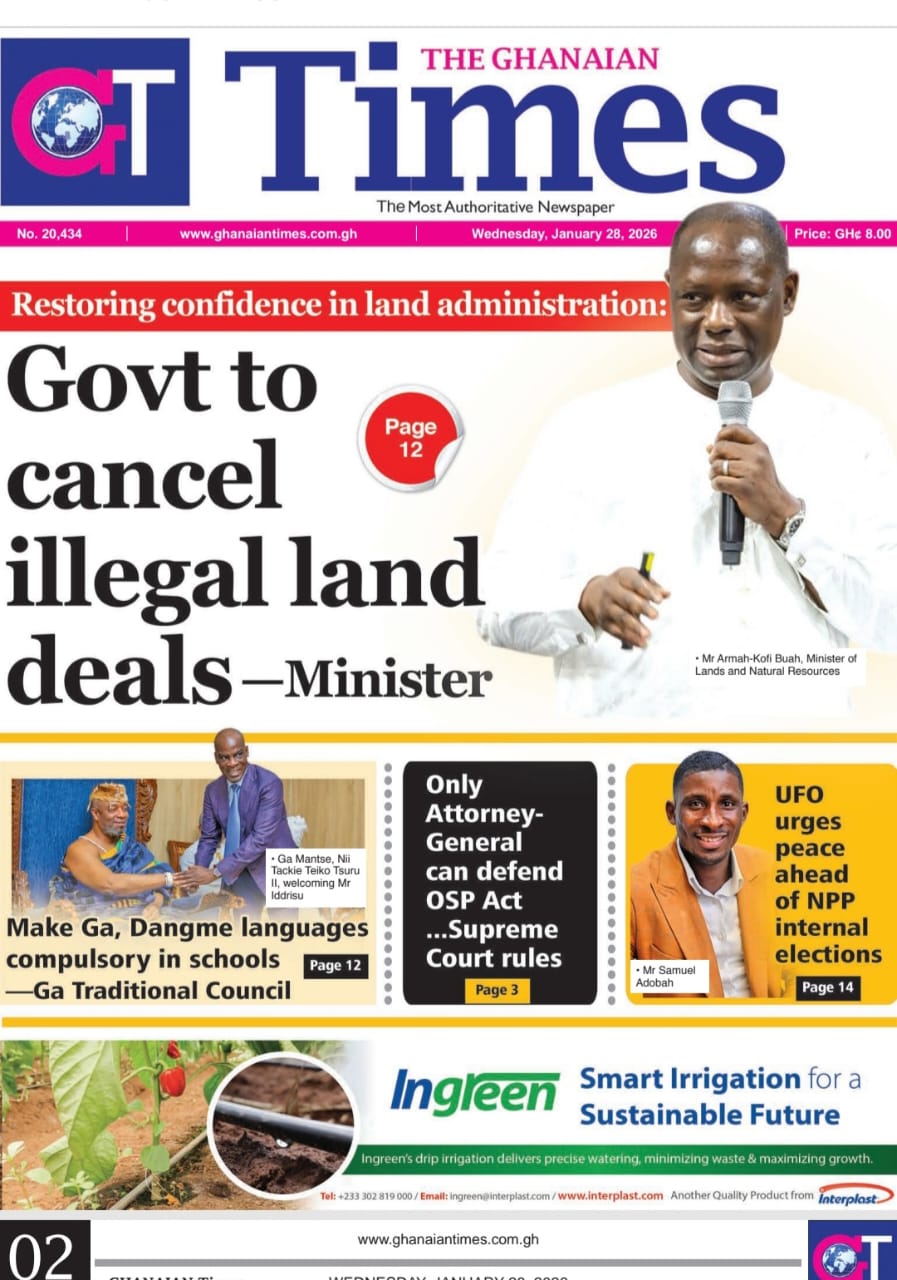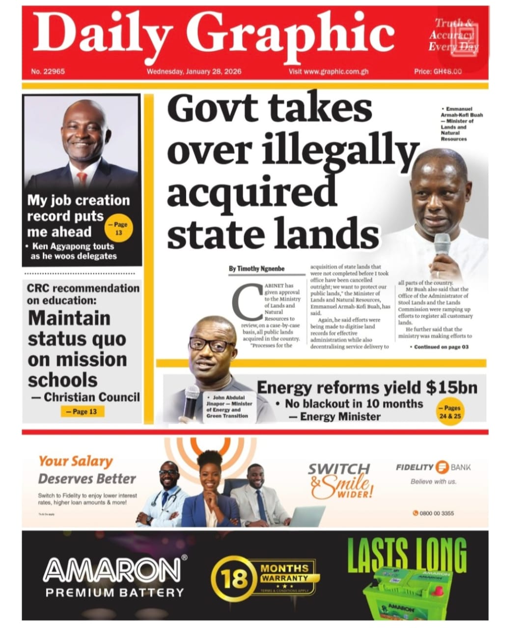 Newspaper headlines: Wednesday, January 28, 2026 Date: 28 January 2026 By Vincent Ashitey Category: general news Shares Share Tweet Email Share Here are the front pages of some of Ghana’s newspapers today.