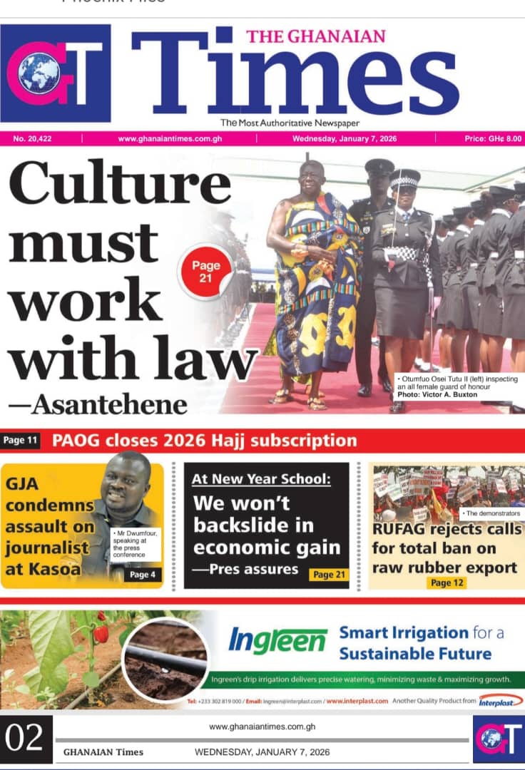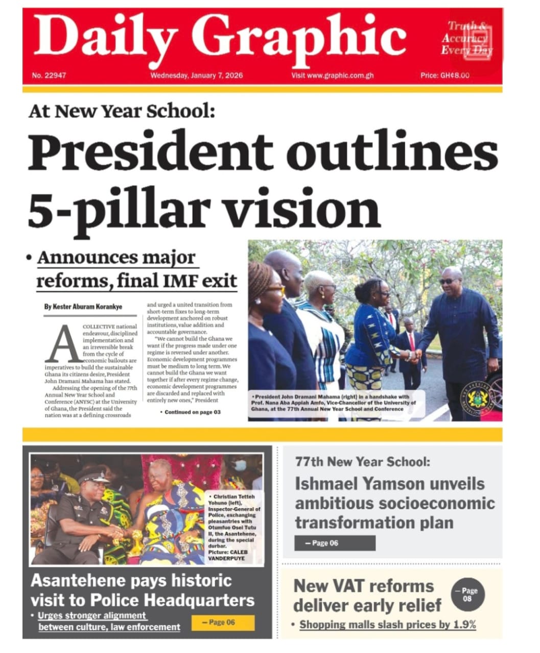 Newspaper headlines: Wednesday, January 7, 2026 Date: 07 January 2026 By Vincent Ashitey Category: general news Shares Share Tweet Email Share Here are the front pages of some of Ghana’s newspapers today.