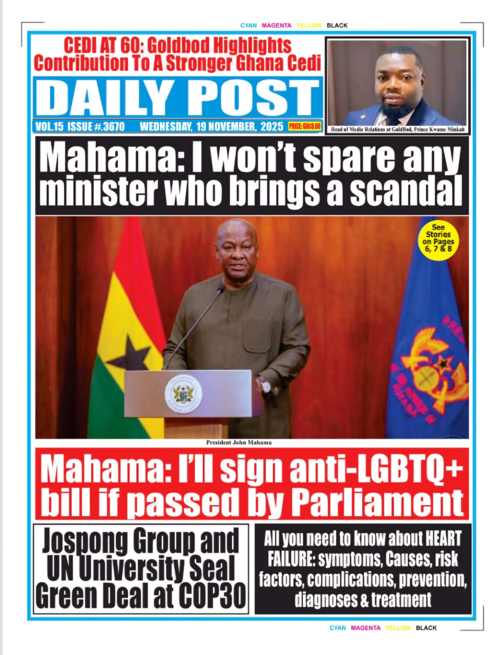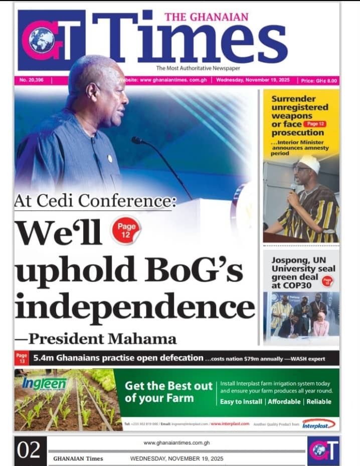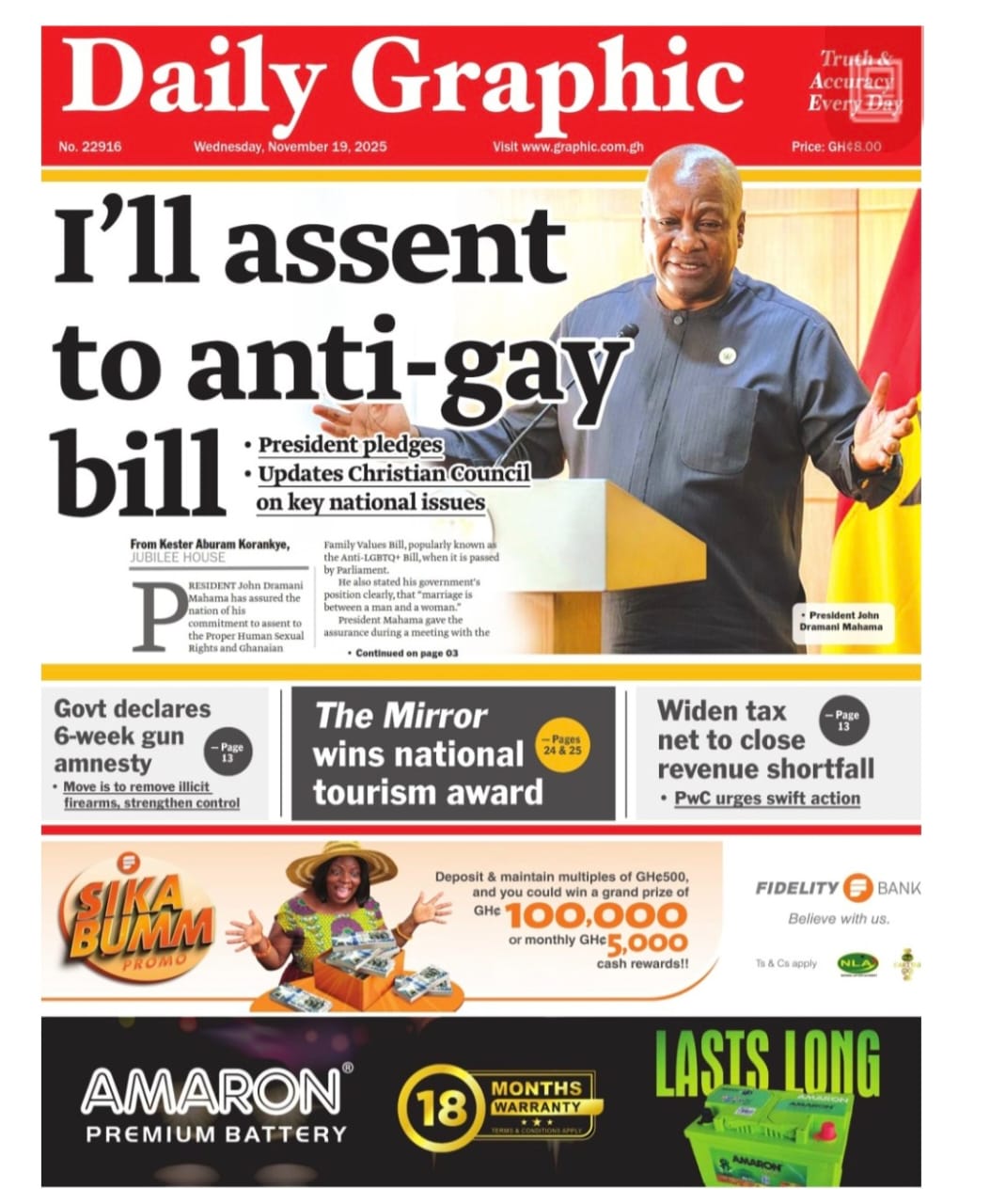 Newspaper headlines: Wednesday, November 19, 2025 Date: 19 November 2025 By Vincent Ashitey Category: general news Shares Share Tweet Email Share Here are the front pages of some of Ghana’s newspapers today.