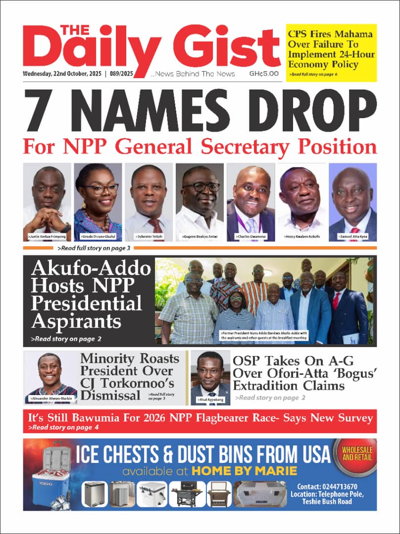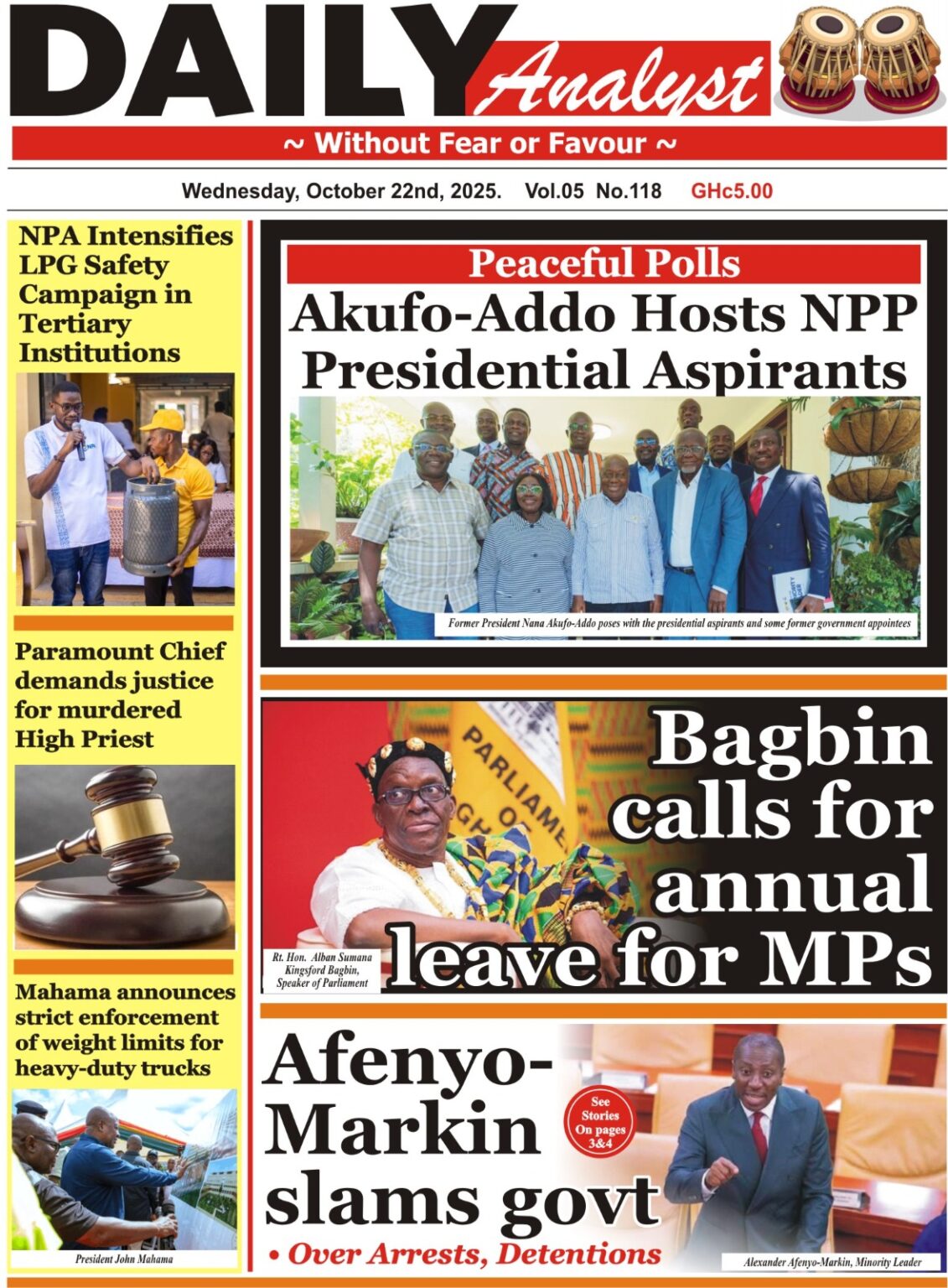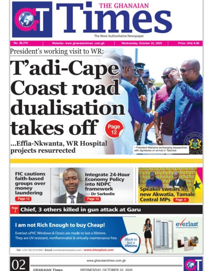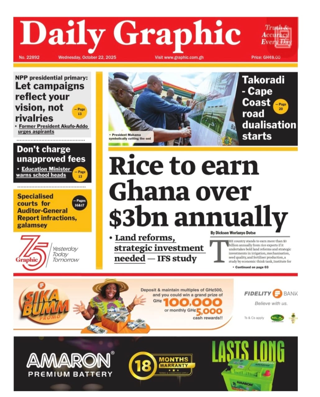Newspaper headlines: Wednesday, October 22, 2025 Date: 22 October 2025 By Vincent Ashitey Category: general news Shares Share Tweet Email Share Here are the front pages of some of Ghana’s newspapers today.