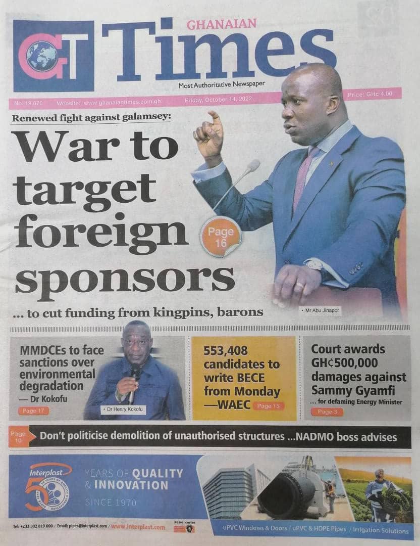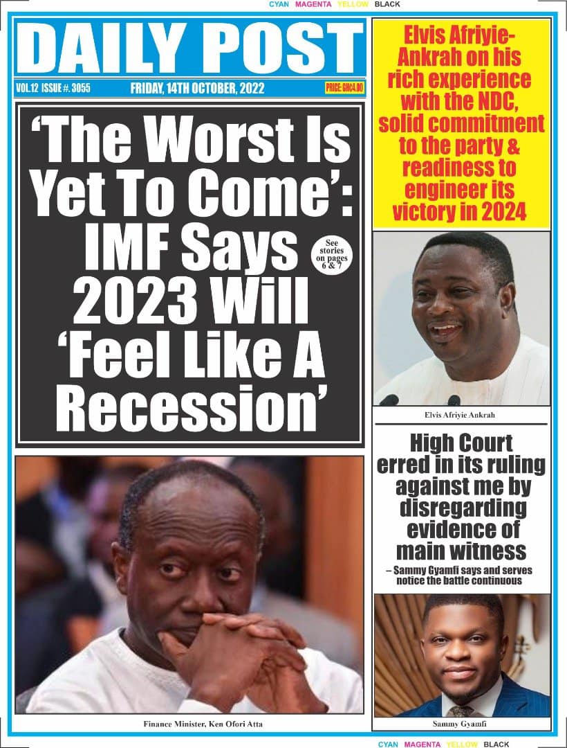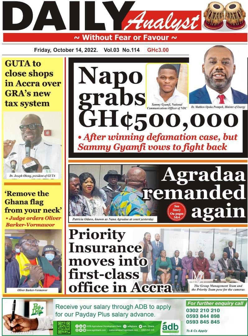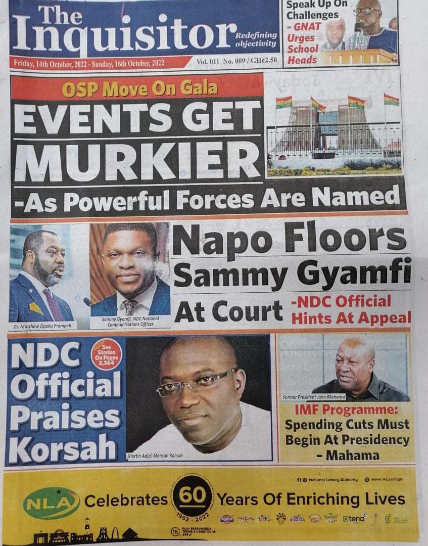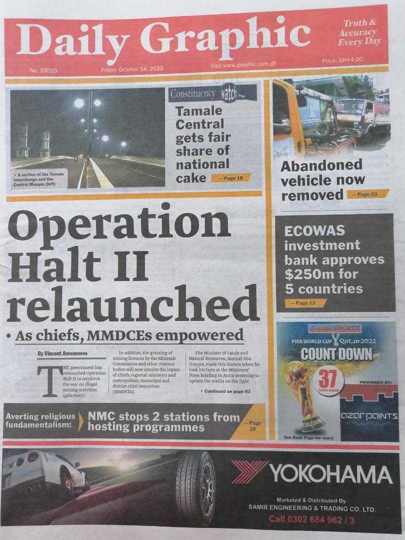 Newspapers headlines: Friday, October 14, 2022 Date: 14 October 2022 By Vincent Ashitey Category: general news Shares Share Tweet Email Share Here are the front pages of some of Ghana's newspapers today.