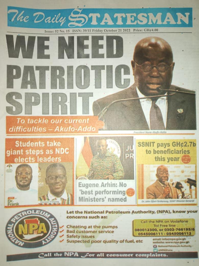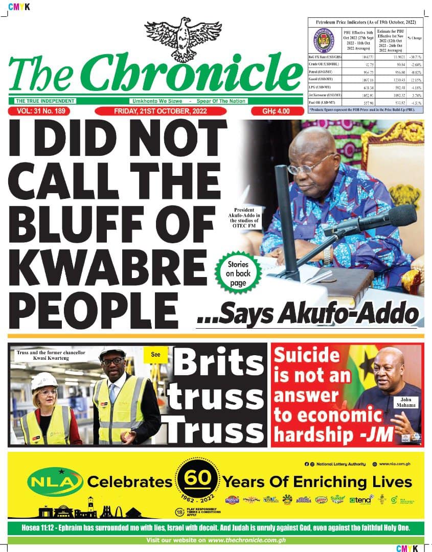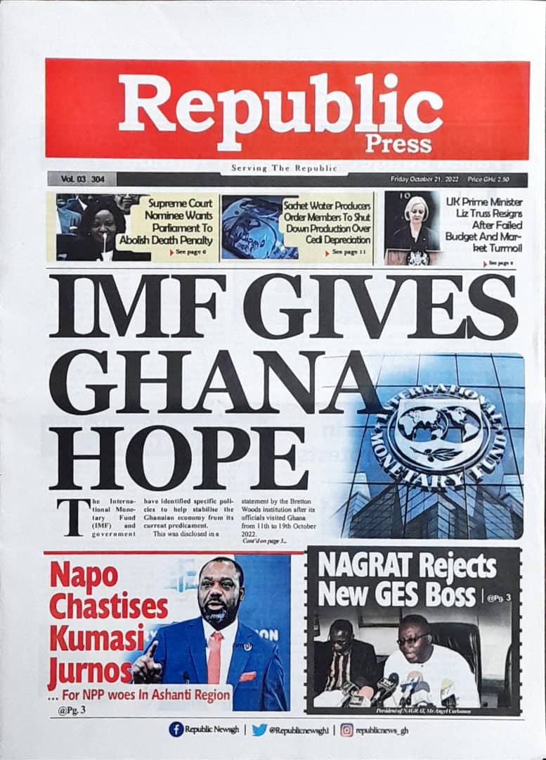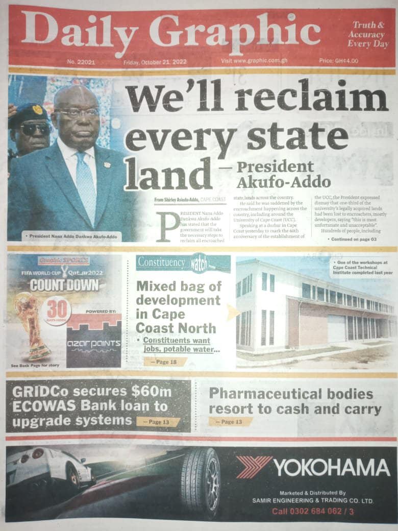 Newspapers headlines: Friday, October 21, 2022 Date: 21 October 2022 By Vincent Ashitey Category: general news Shares Share Tweet Email Share Here are the front pages of some of Ghana's newspapers today.