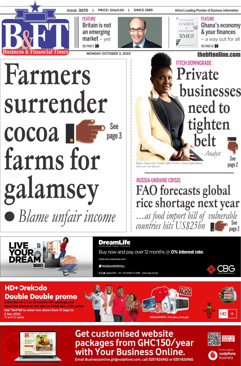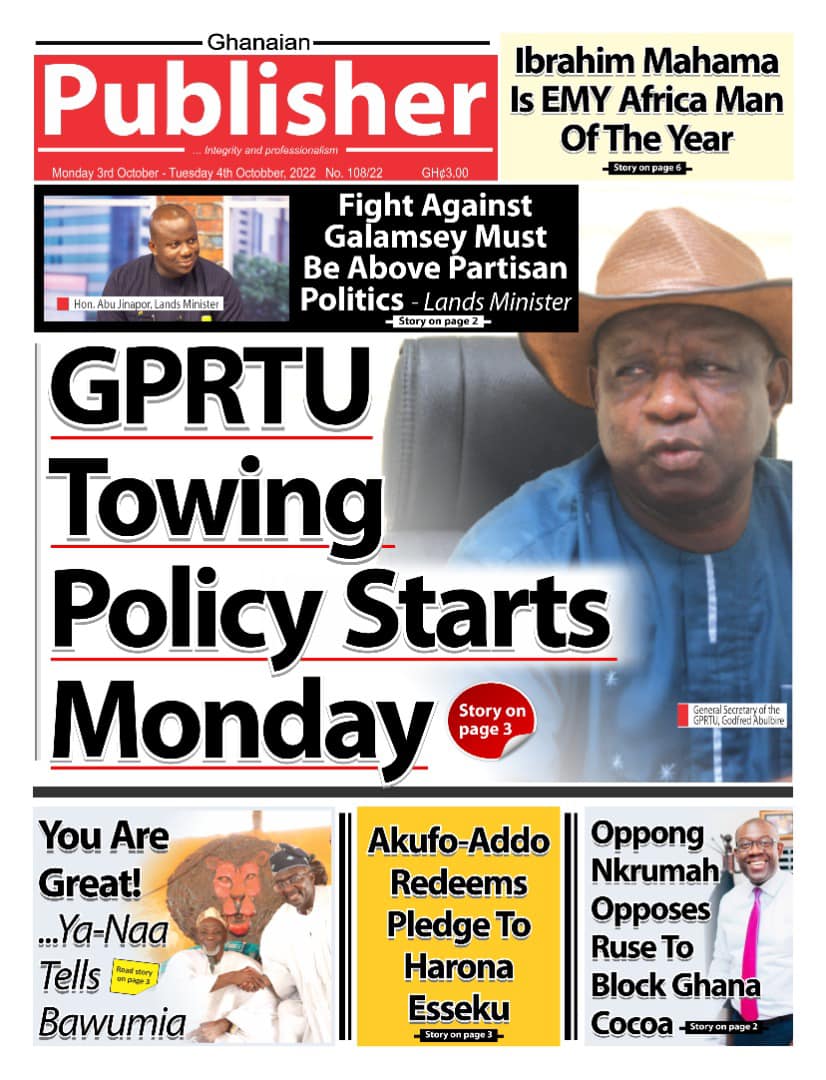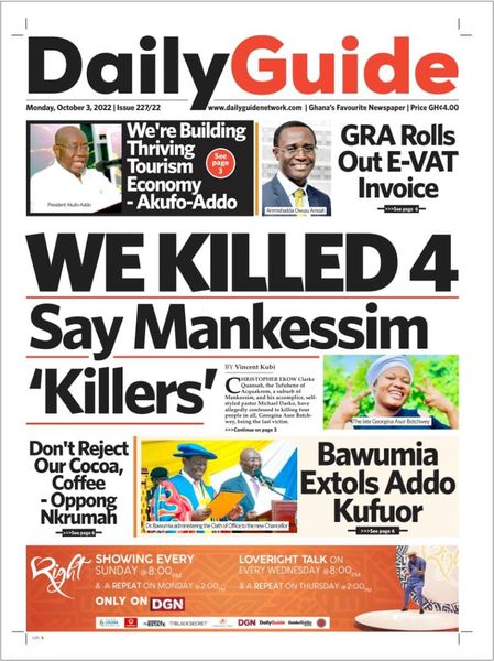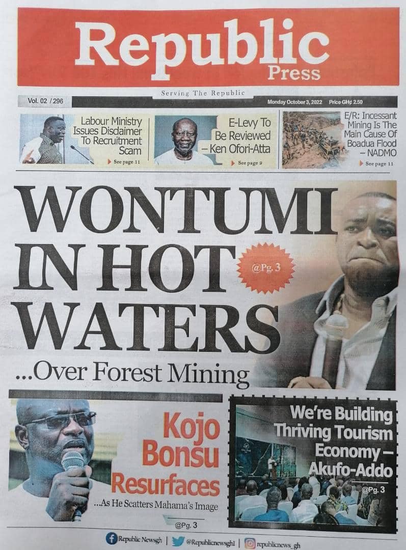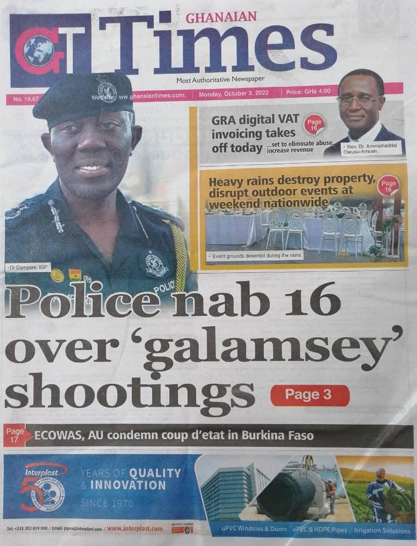 Newspapers headlines: Monday, October 3, 2022 Date: 03 October 2022 By Vincent Ashitey Category: general news Shares Share Tweet Email Share Here are the front pages of some of Ghana's newspapers today.