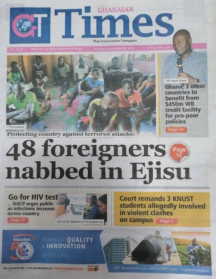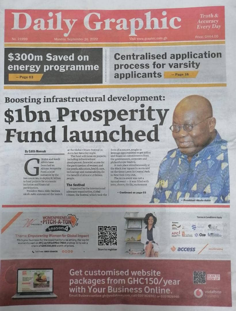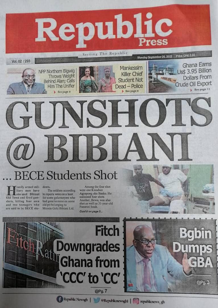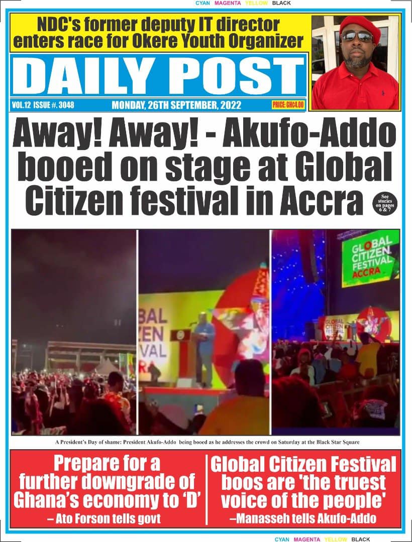 Newspapers headlines: Monday, September 26, 2022 Date: 26 September 2022 By Vincent Ashitey Category: general news Shares Share Tweet Email Share Here are the front pages of some of Ghana's newspapers today.