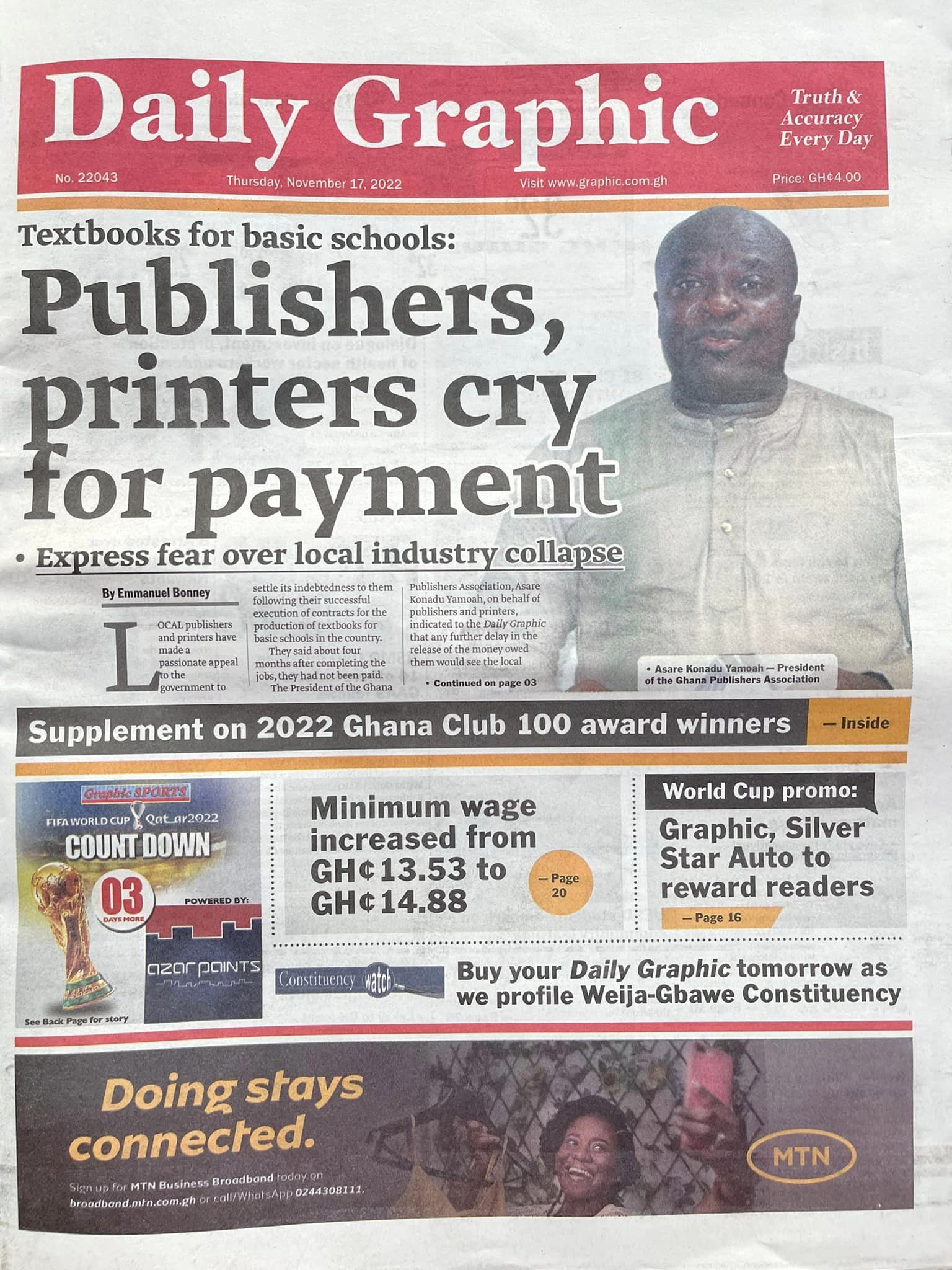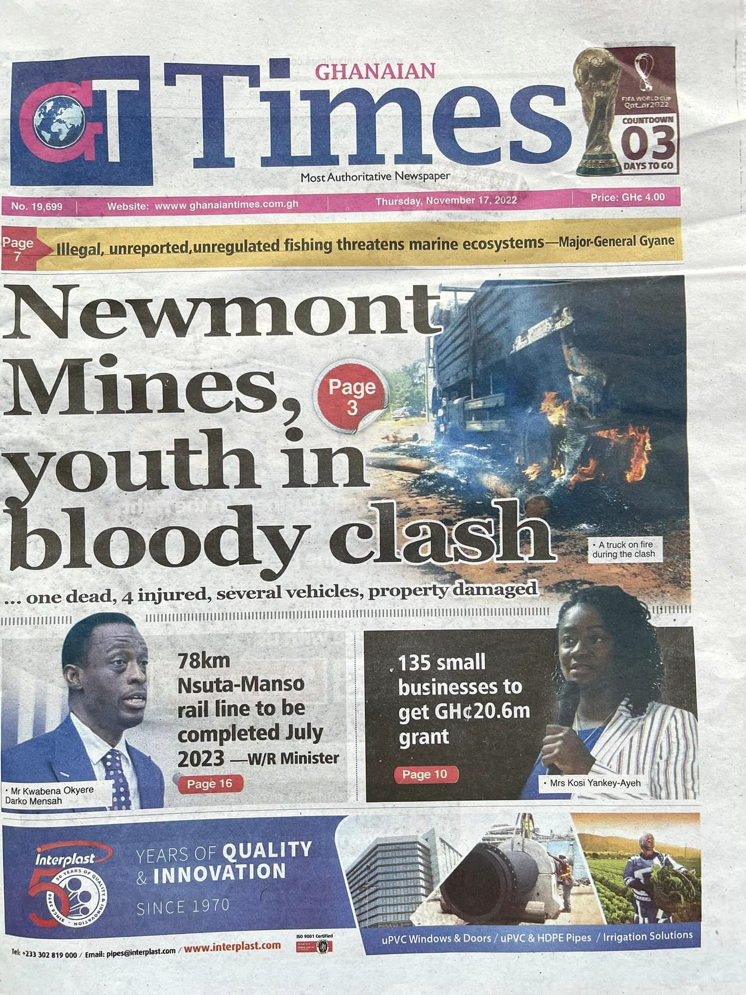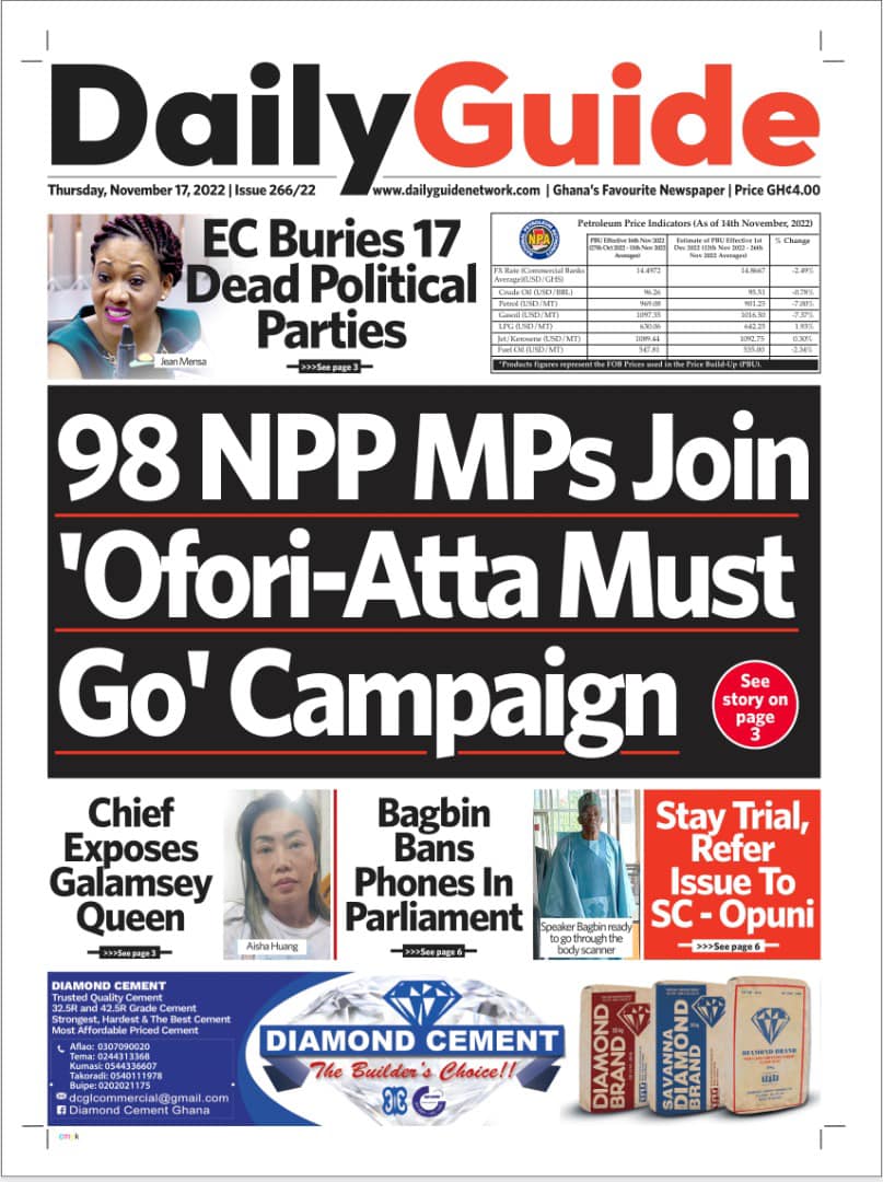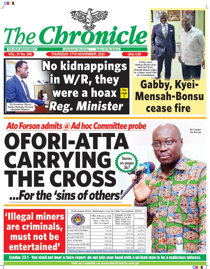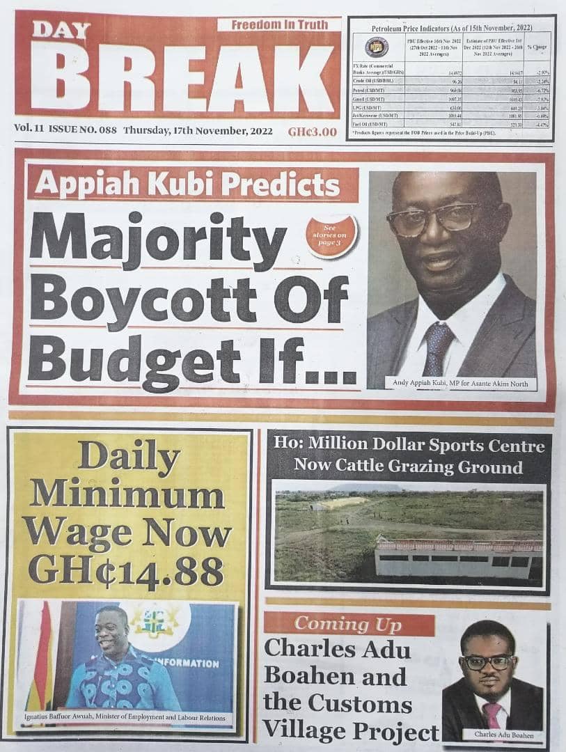 Newspapers headlines: Thursday, November 17, 2022 Date: 17 November 2022 By Vincent Ashitey Category: general news Shares Share Tweet Email Share Here are the front pages of some of Ghana's newspapers today.