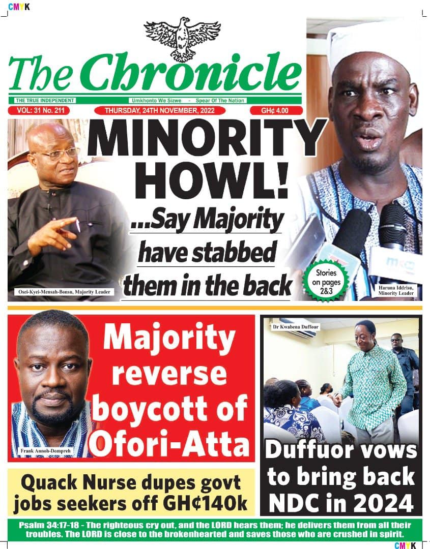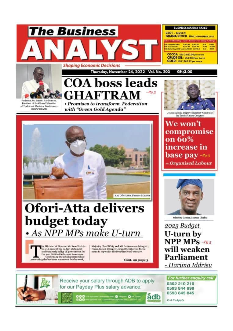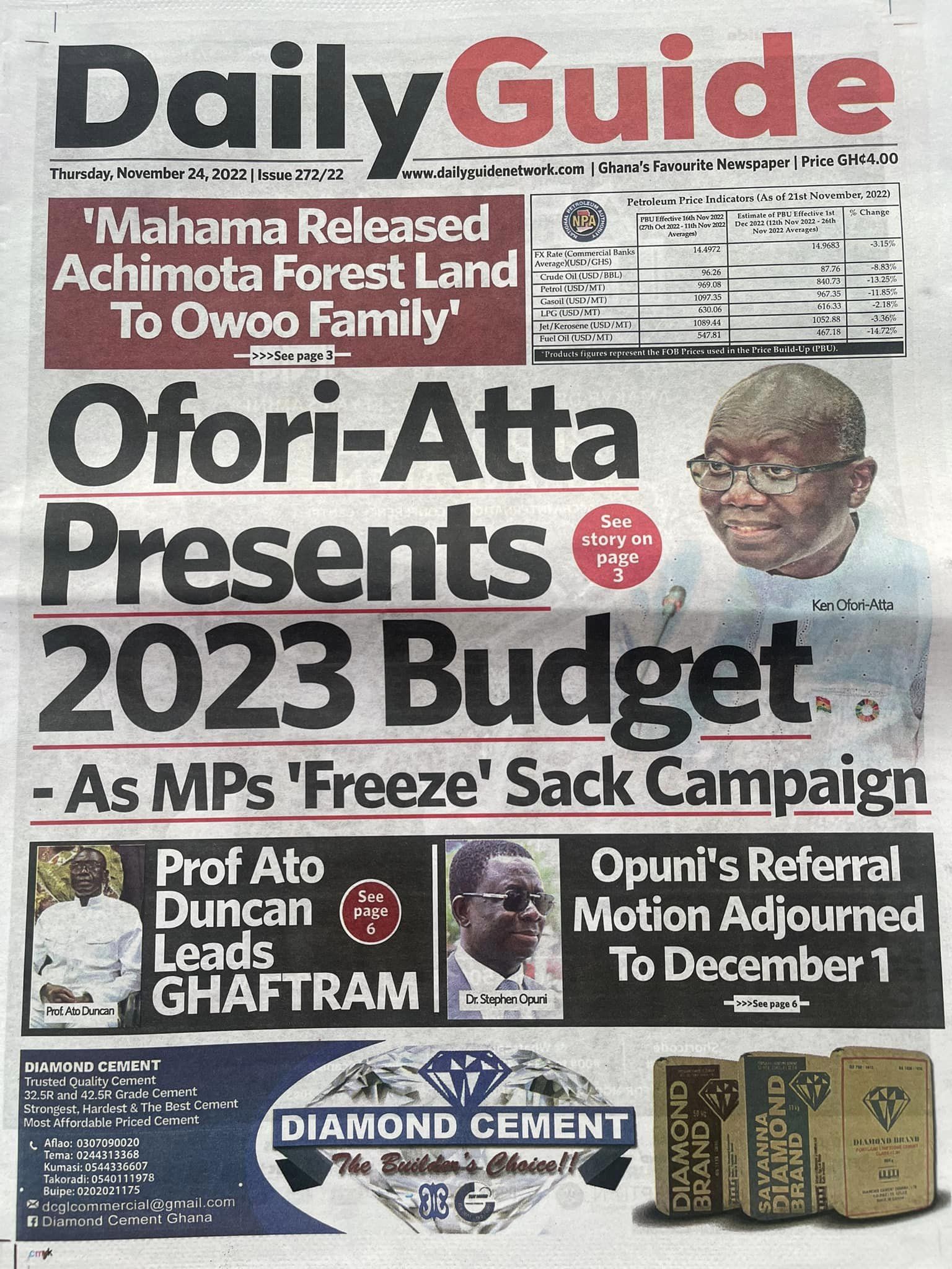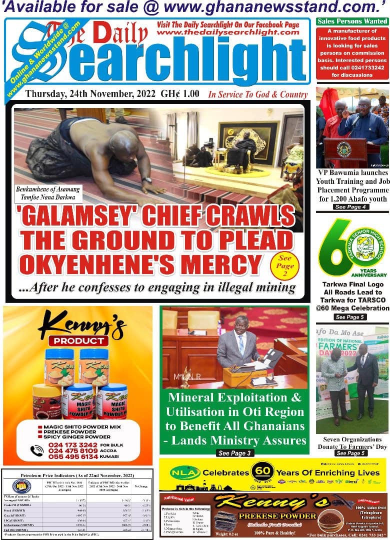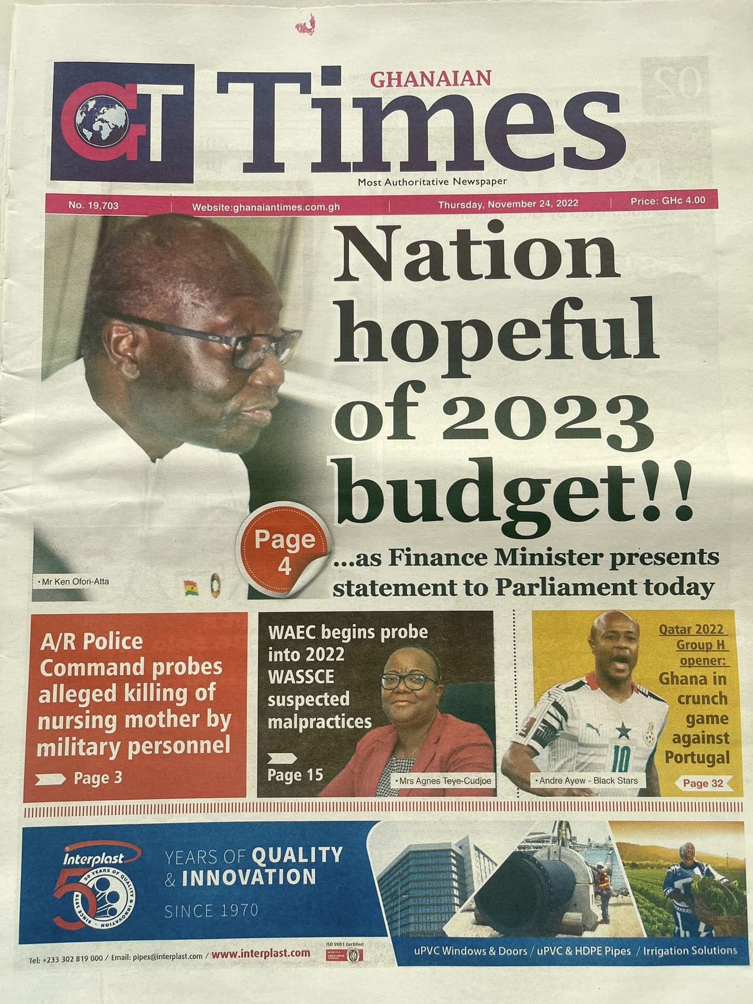 Newspapers headlines: Thursday, November 24, 2022 Date: 24 November 2022 By Vincent Ashitey Category: general news Shares Share Tweet Email Share Here are the front pages of some of Ghana's newspapers today.