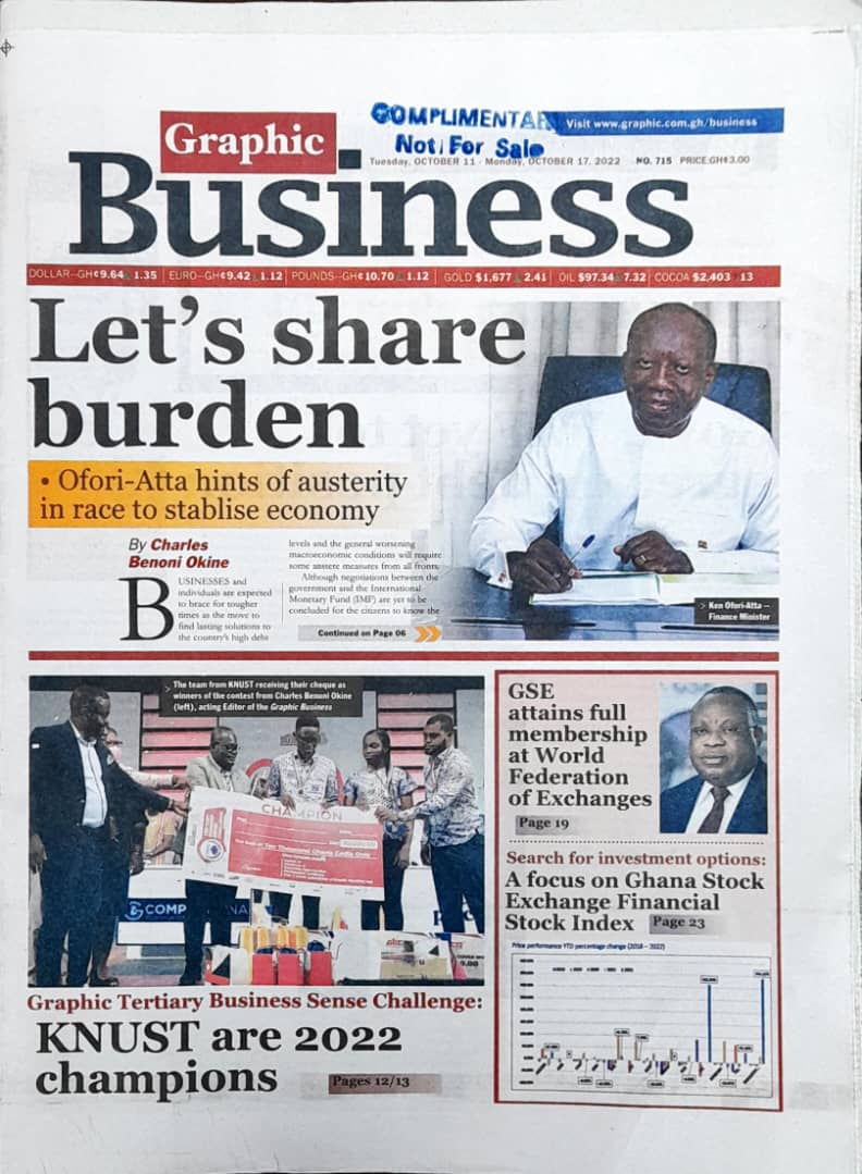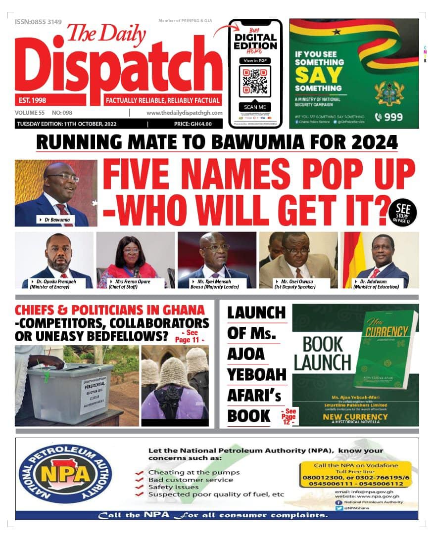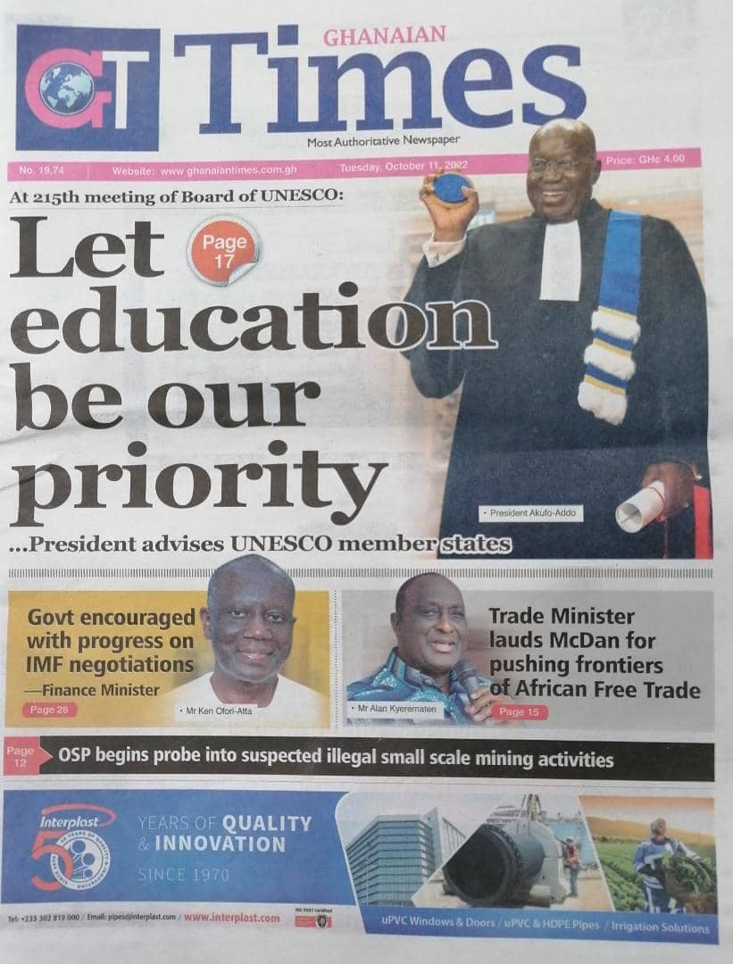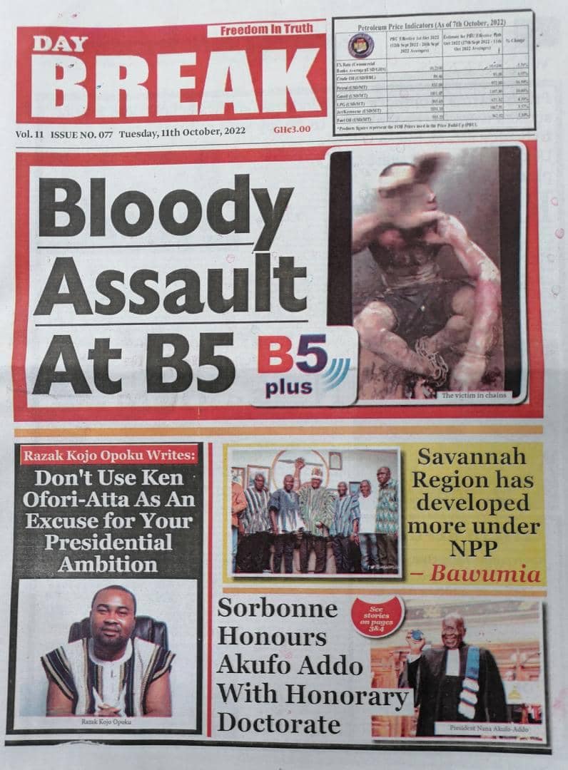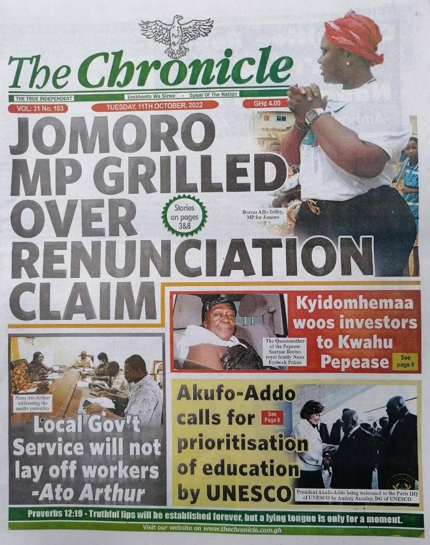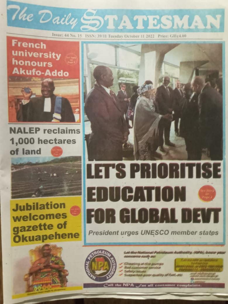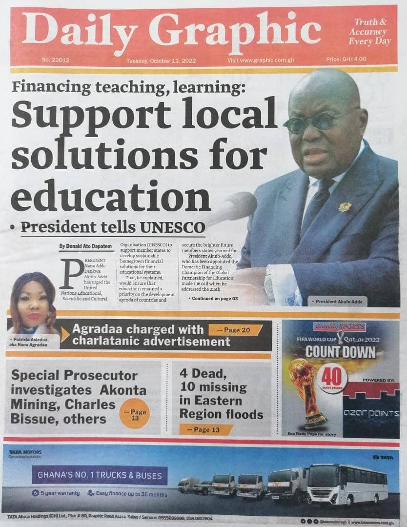 Newspapers headlines: Tuesday, October 11, 2022 Date: 11 October 2022 By Vincent Ashitey Category: general news Shares Share Tweet Email Share Here are the front pages of some of Ghana's newspapers today.