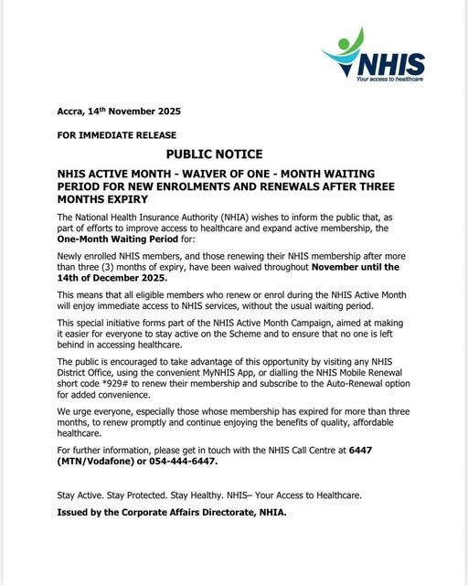 The waiver, which took effect from 1 November, will run until 14 December 2025 as part of the NHIS Active Month campaign.