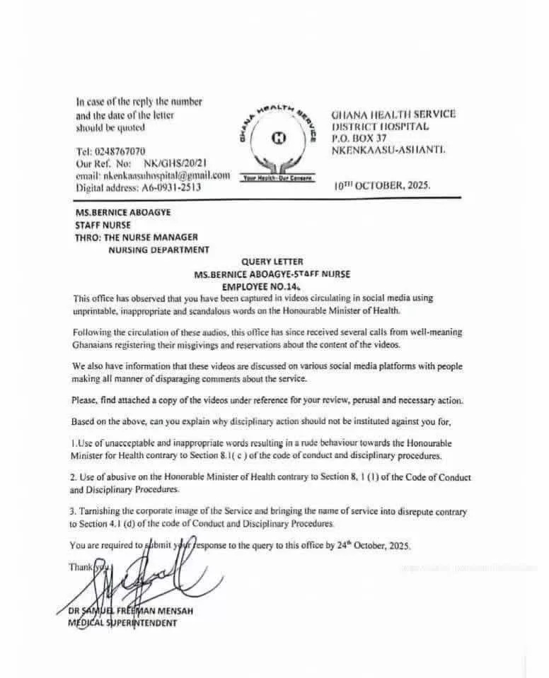 A staff nurse identified as Ms. Bernice Aboagye has been issued a query letter by her employers after she was captured in a viral video using abusive and inappropriate language against the Minister of Health, Mintah Akandoh.