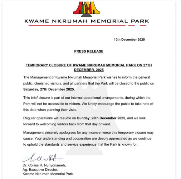 “The Management of Kwame Nkrumah Memorial Park wishes to inform the general public, cherished visitors, and all partners that the Park will be closed to the public on Saturday, 27th December 2025,” the statement said.