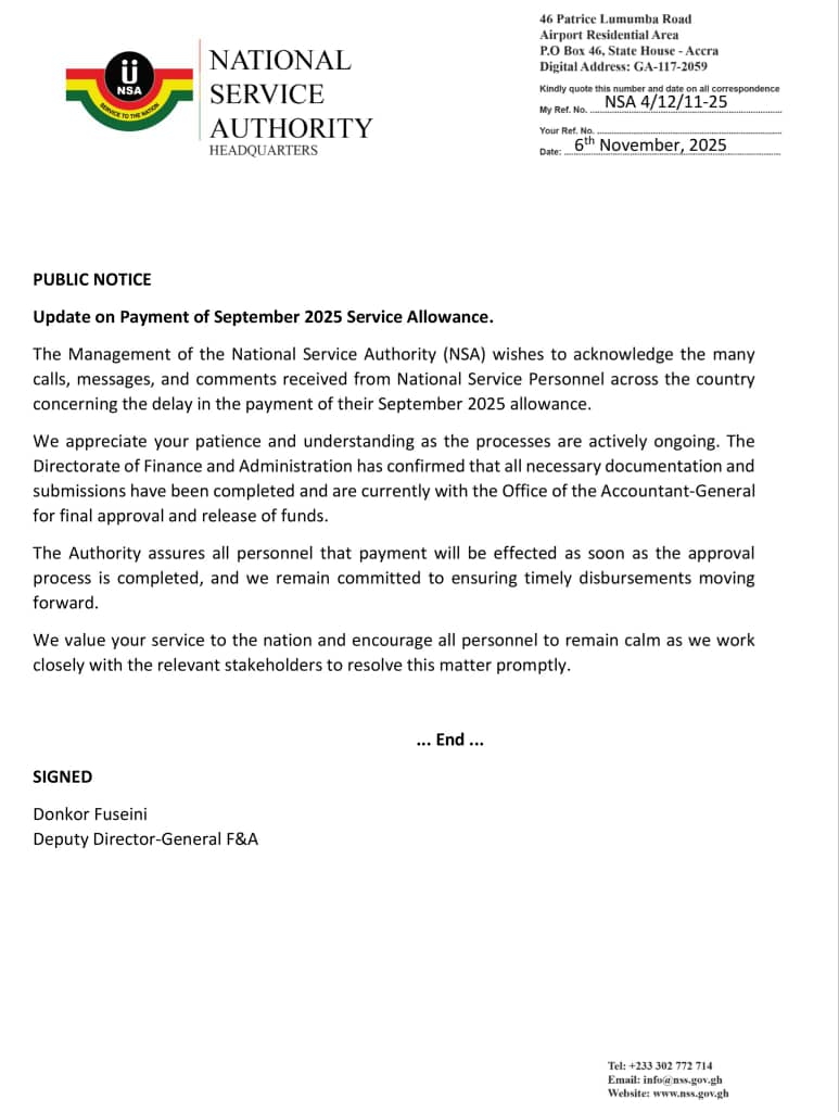 In a public notice dated Thursday, November 6, 2025, signed by Deputy Director-General for Finance and Administration Donkor Fuseini, the NSA acknowledged receiving numerous calls, messages, and complaints regarding the delayed payments.