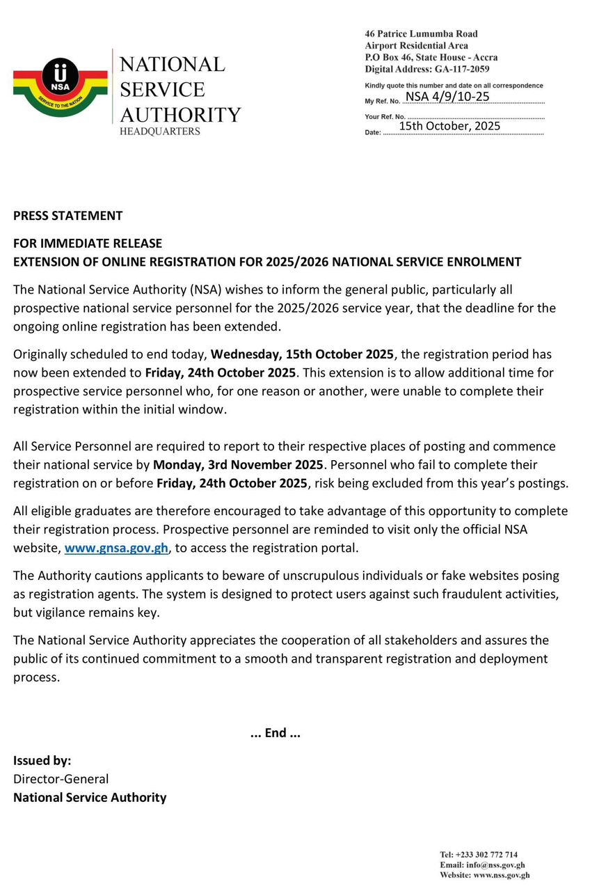 The National Service Authority has extended the deadline for online registration for the 2025/2026 national service year to Friday, October 24, 2025.