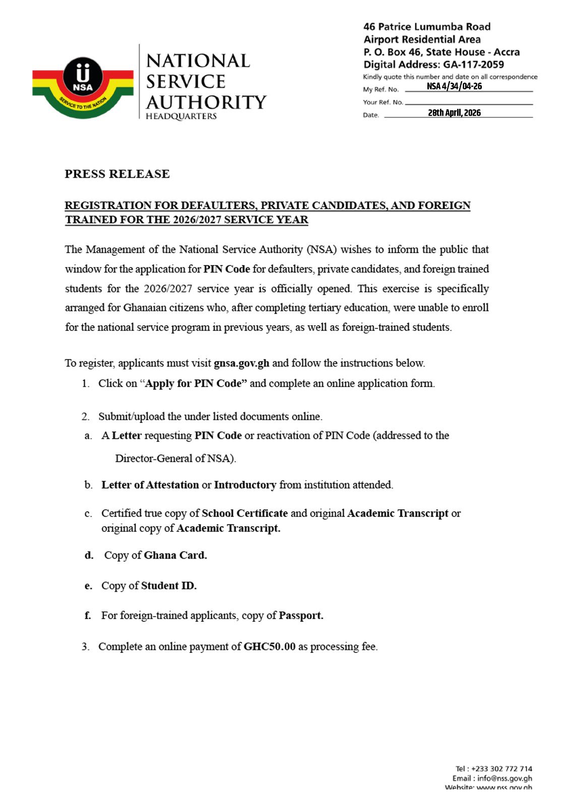 In a press release dated April 28, 2026, and signed by Director-General Ruth Dela Seddoh, the Authority said the exercise targets Ghanaian graduates who were unable to enrol for national service in previous years, as well as those who studied abroad.