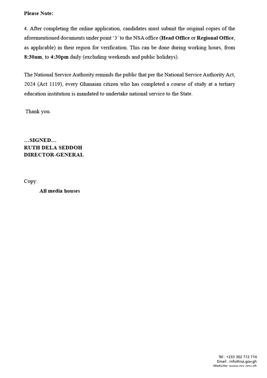 The Authority reminded the public that under the National Service Authority Act, 2024 (Act 1119), all Ghanaian tertiary graduates are required to undertake national service. It urged eligible applicants to take advantage of the registration window and comply with the requirements to avoid sanctions.