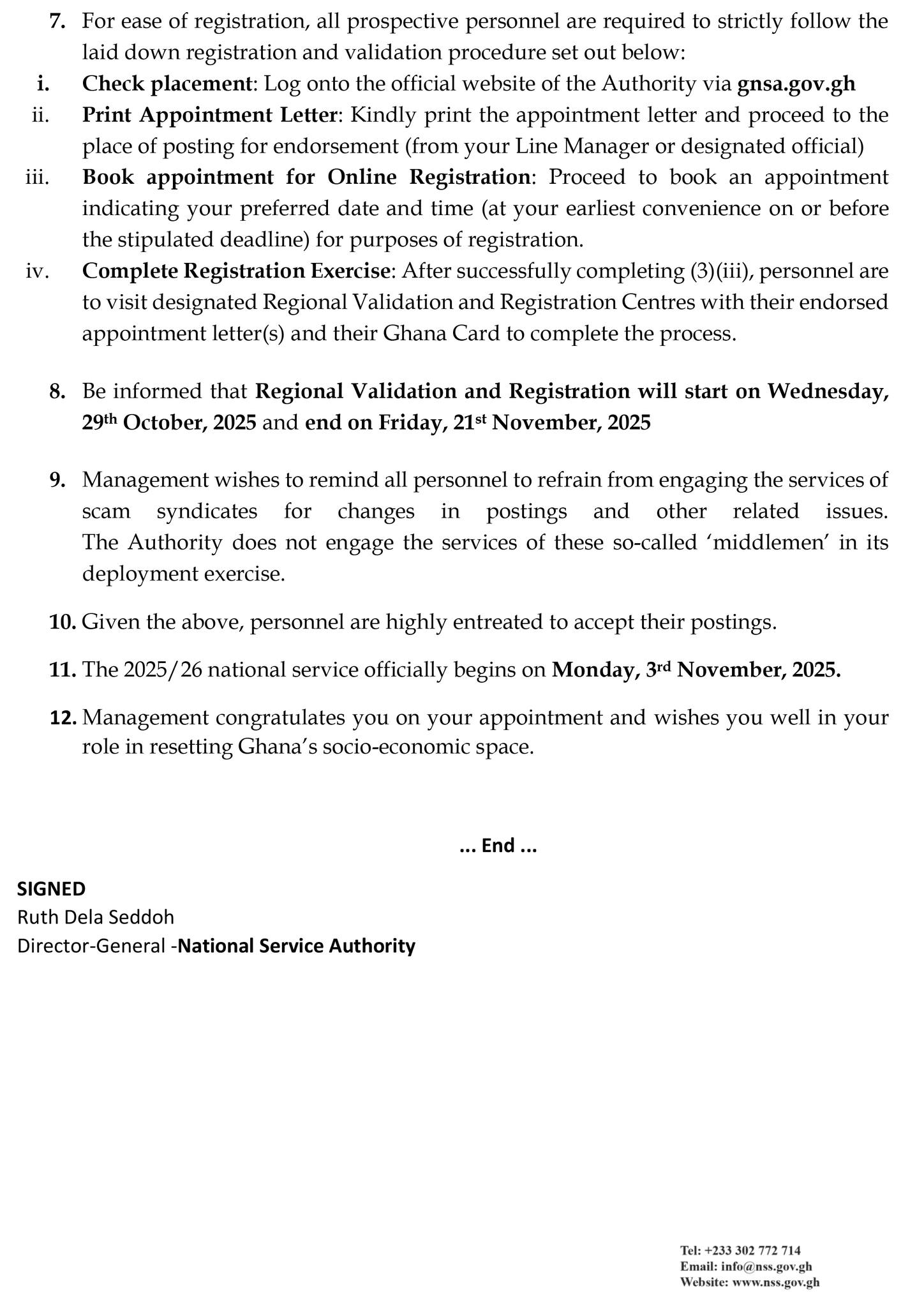 The regional validation and registration process will begin on Wednesday, October 29, 2025, and end on Friday, November 21, 2025, while the 2025/2026 national service officially begins on Monday, November 3, 2025.