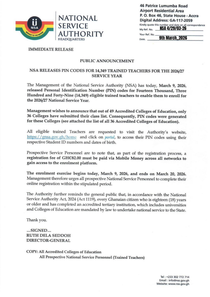The National Service Authority (NSA) on Monday, March 9, 2026, released Personal Identification Number (PIN) codes for 14,349 eligible trained teachers to enable them to register for the 2026/27 National Service Year.