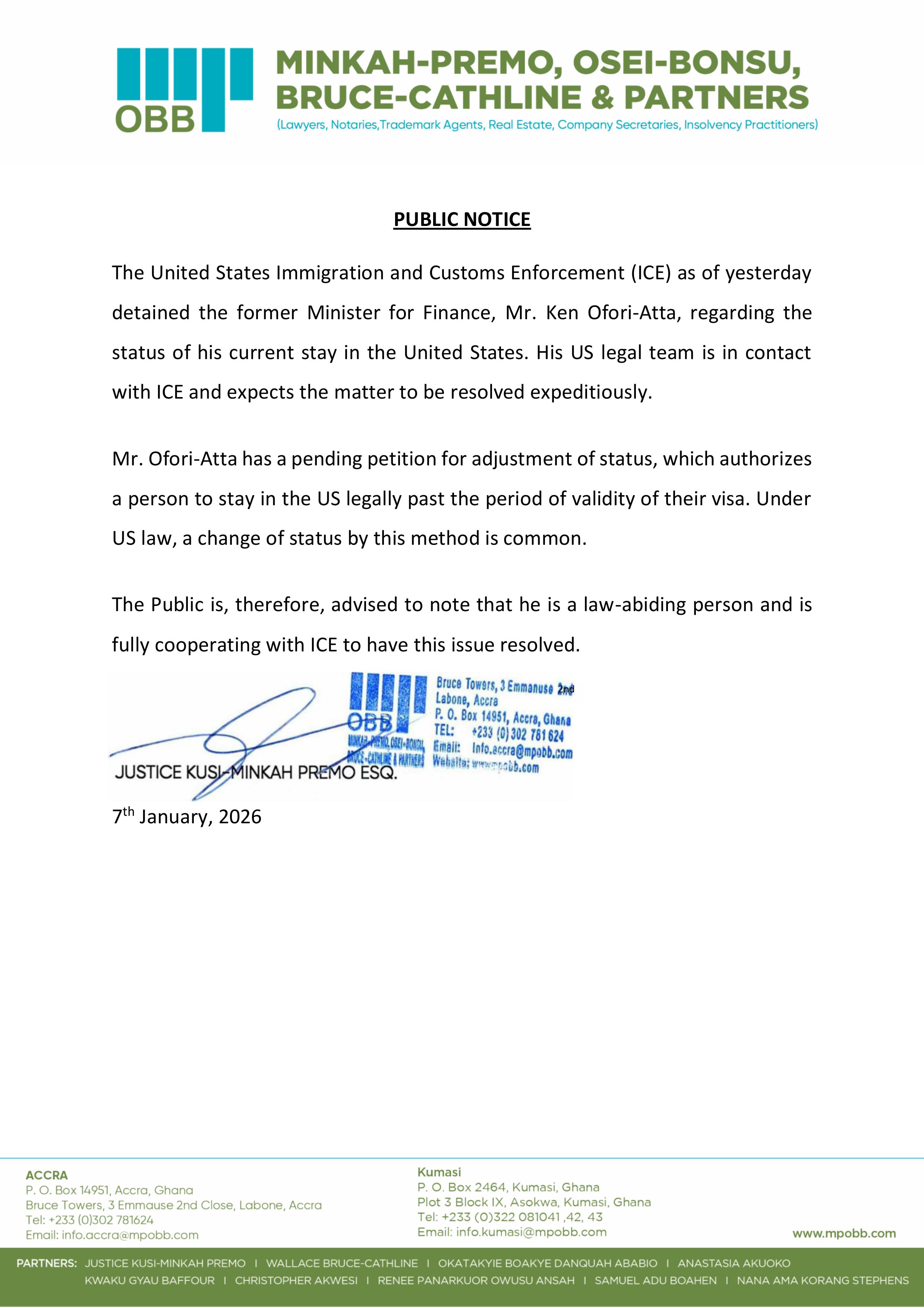 In a statement dated Wednesday, January 7, 2026, the law firm confirmed that Ofori-Atta's detention was in relation to the status of his current stay in the United States.