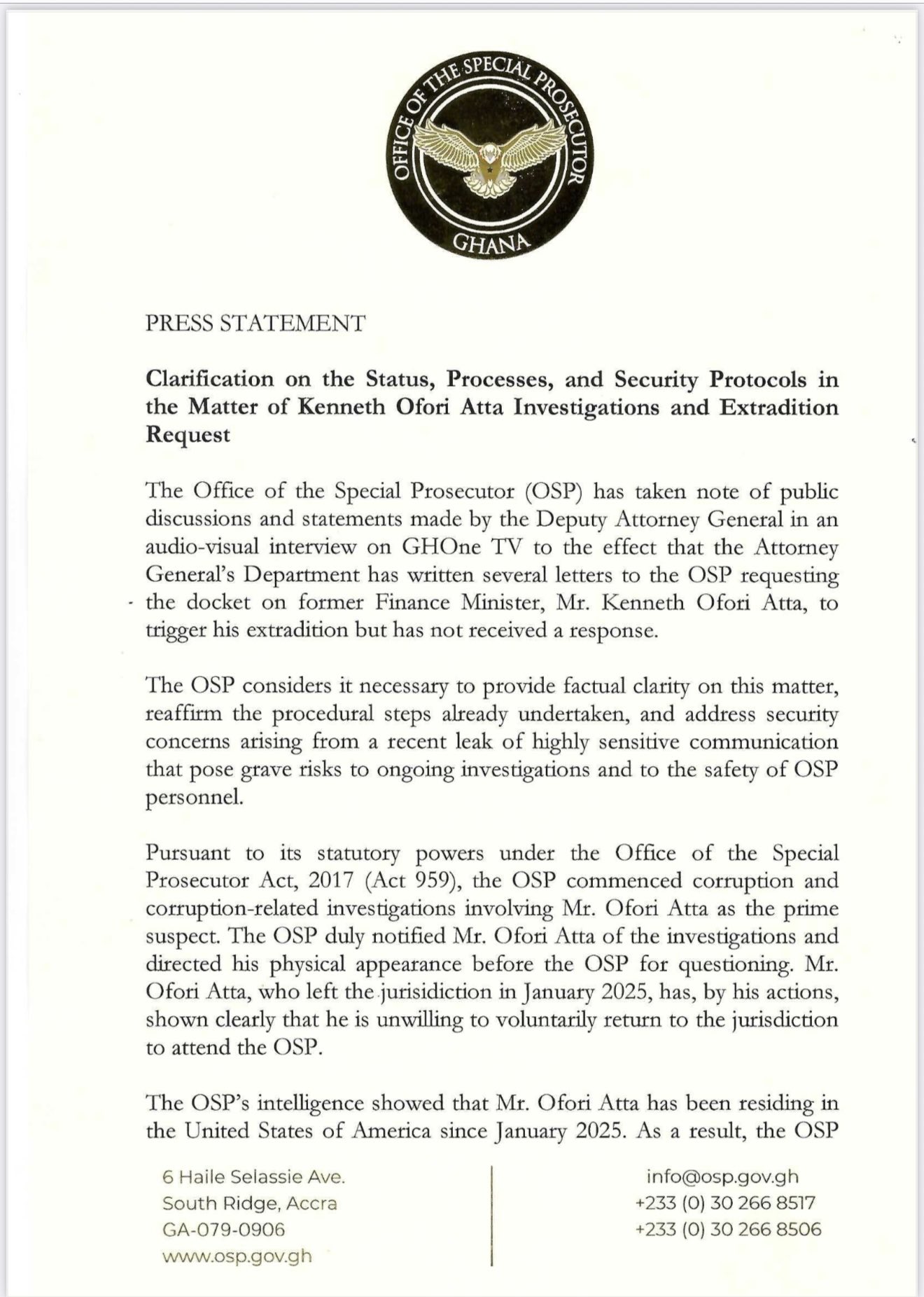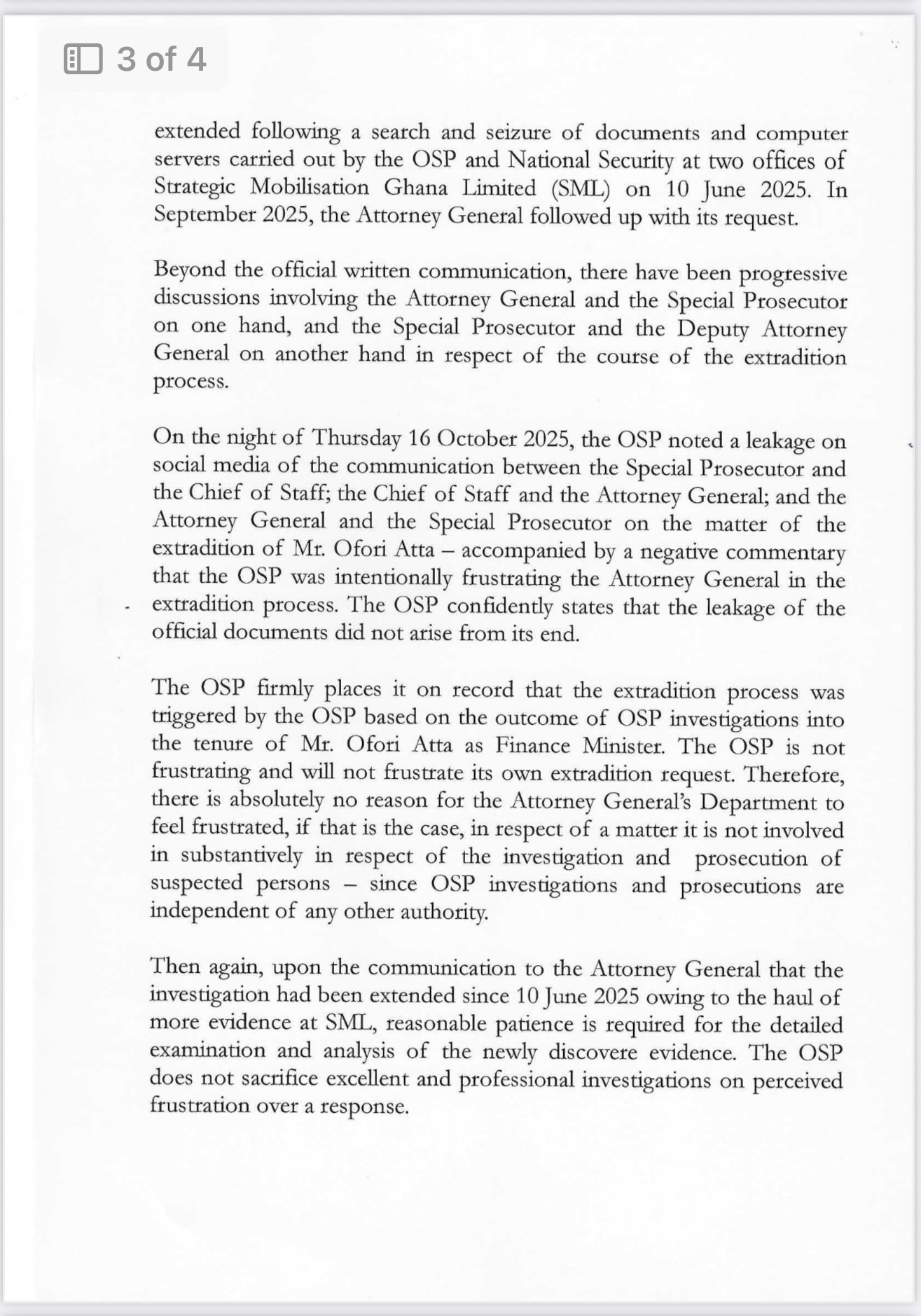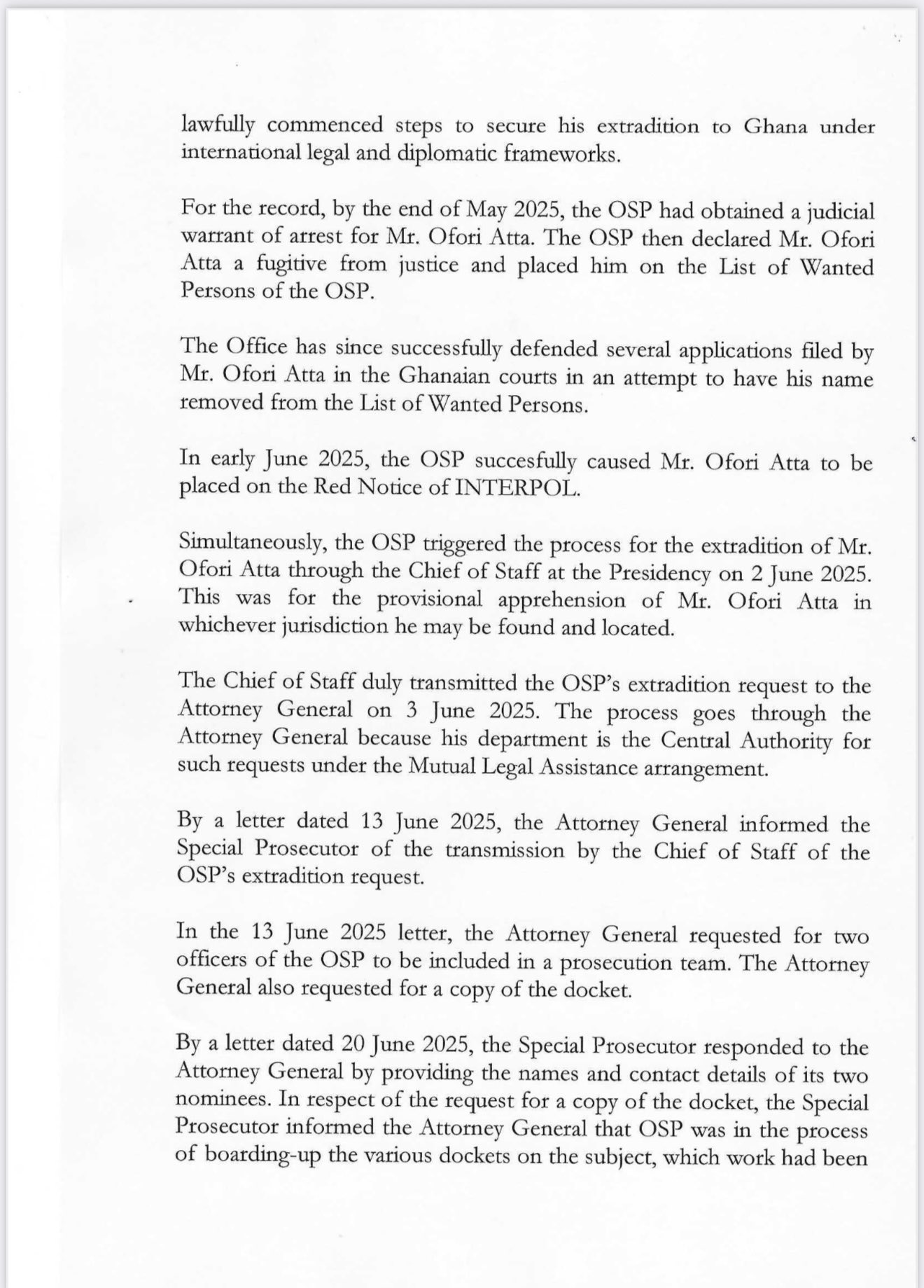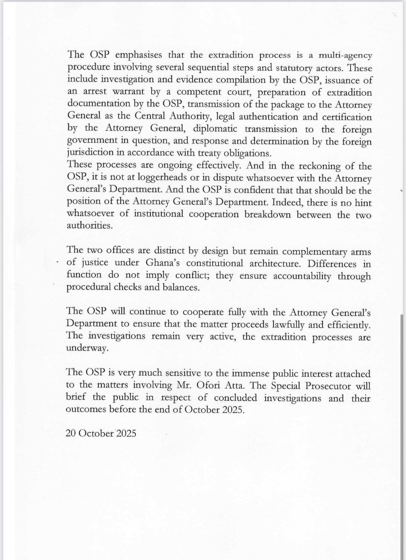 “There is no bad blood between the Office of the Special Prosecutor (OSP) and the Attorney-General (AG), nor is there any contention over the case docket. The issue at hand is primarily one of timing. The OSP is nearing completion of its work on some of the cases involving Mr. Kenneth Ofori-Atta and will, in due course, submit the necessary information required to complete the extradition process to the AG,” he said.