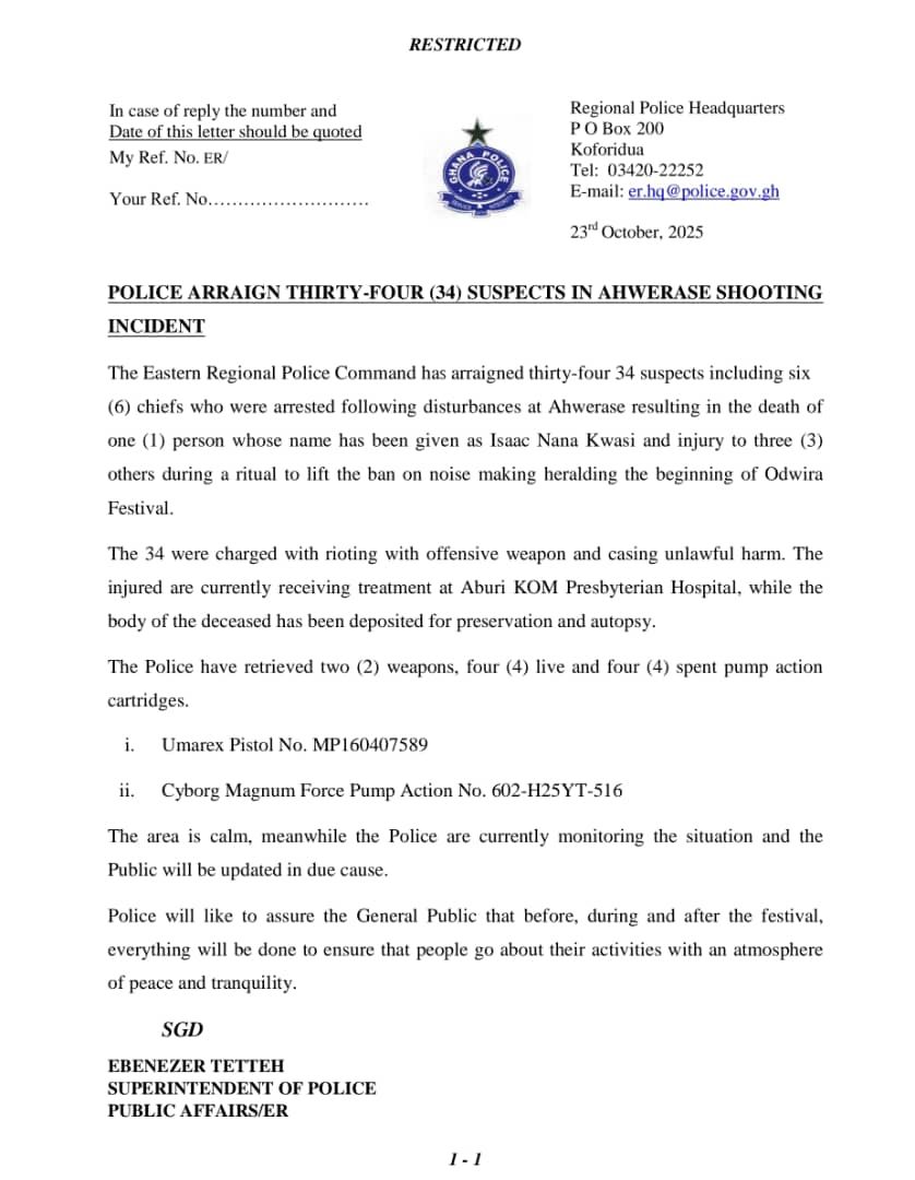 The Eastern Regional Police Command has arraigned 34 suspects, including six chiefs, over a violent incident in Ahwerase that left one person dead and three others injured during a ceremony linked to the annual Odwira Festival.