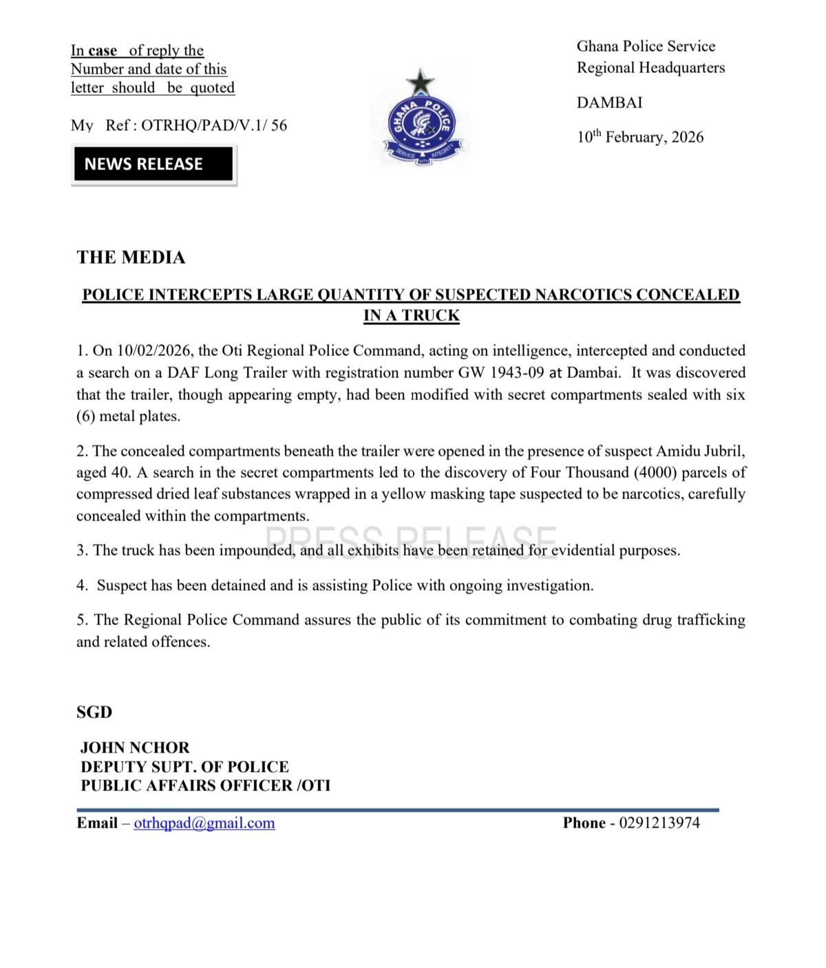 The Oti Regional Police Command has intercepted a large consignment of suspected narcotics concealed in a long trailer at Dambai in the Oti Region.