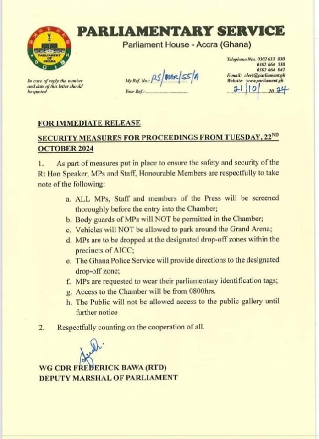A statement issued by Wing commander Fredrick Bawa (rtd), Deputy Marshall of Parliament, said the measures were being put in place to ensure the safety and security of the Speaker, Members of Parliament (MPs) and staff.