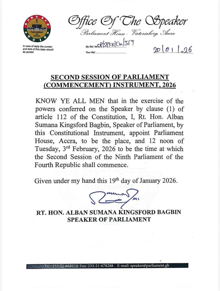 In accordance with the powers vested in him by Article 112(1) of the 1992 Constitution, the Speaker has appointed Tuesday, 3rd February, 2026, at 12:00 noon, as the date and time for the session to begin.
