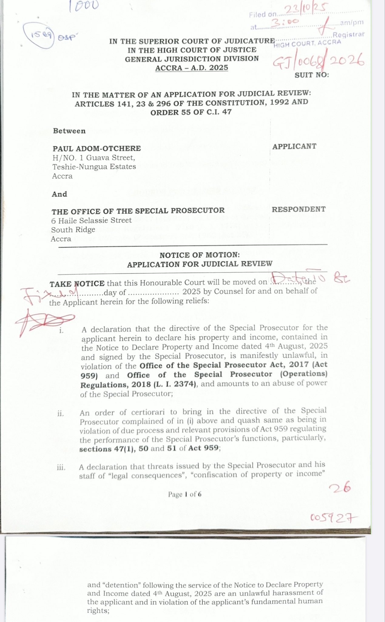 In his application, Adom-Otchere is asking the court to declare that the OSP’s directive, along with what he describes as threats of “legal consequences”, “confiscation”, and “detention”, is unlawful and amounts to harassment.
