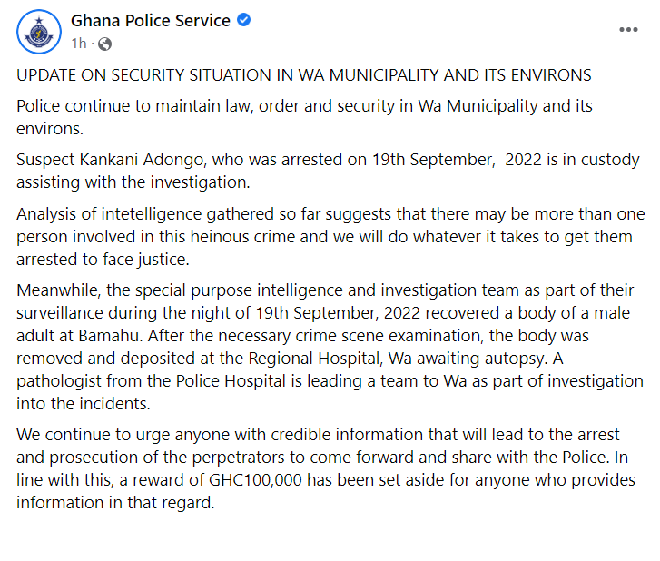 The Ghana Police Service has announced a GH¢100,000 bounty on persons behind the killings in Wa.