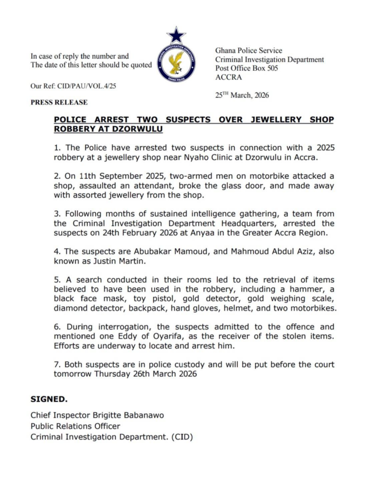 According to a statement issued on Wednesday, March 25 and signed by Chief Inspector Brigitte Babanawo, Public Relations Officer of the CID, the arrests relate to a robbery that took place on September 11, 2025, near Nyaho Clinic.