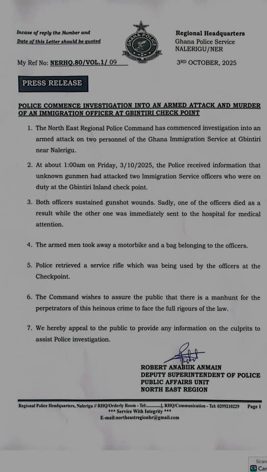 The North East Regional Police Command has commenced investigation into an armed attack on two personnel of the Ghana Immigration Service at Gbintiri near Nalerigu.