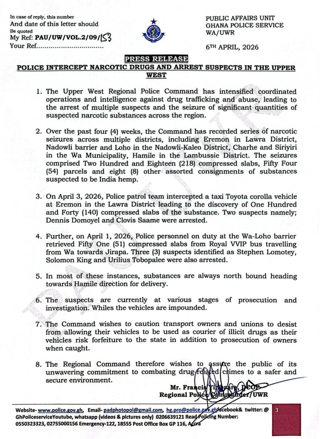 In a separate operation on April 1, 2026, officers at the Wa-Loho barrier retrieved 51 compressed slabs from a Royal VVIP bus travelling from Wa to Jirapa. Three suspects Stephen Lomotey, Solomon King, and Urilius Tobopalee were also arrested.