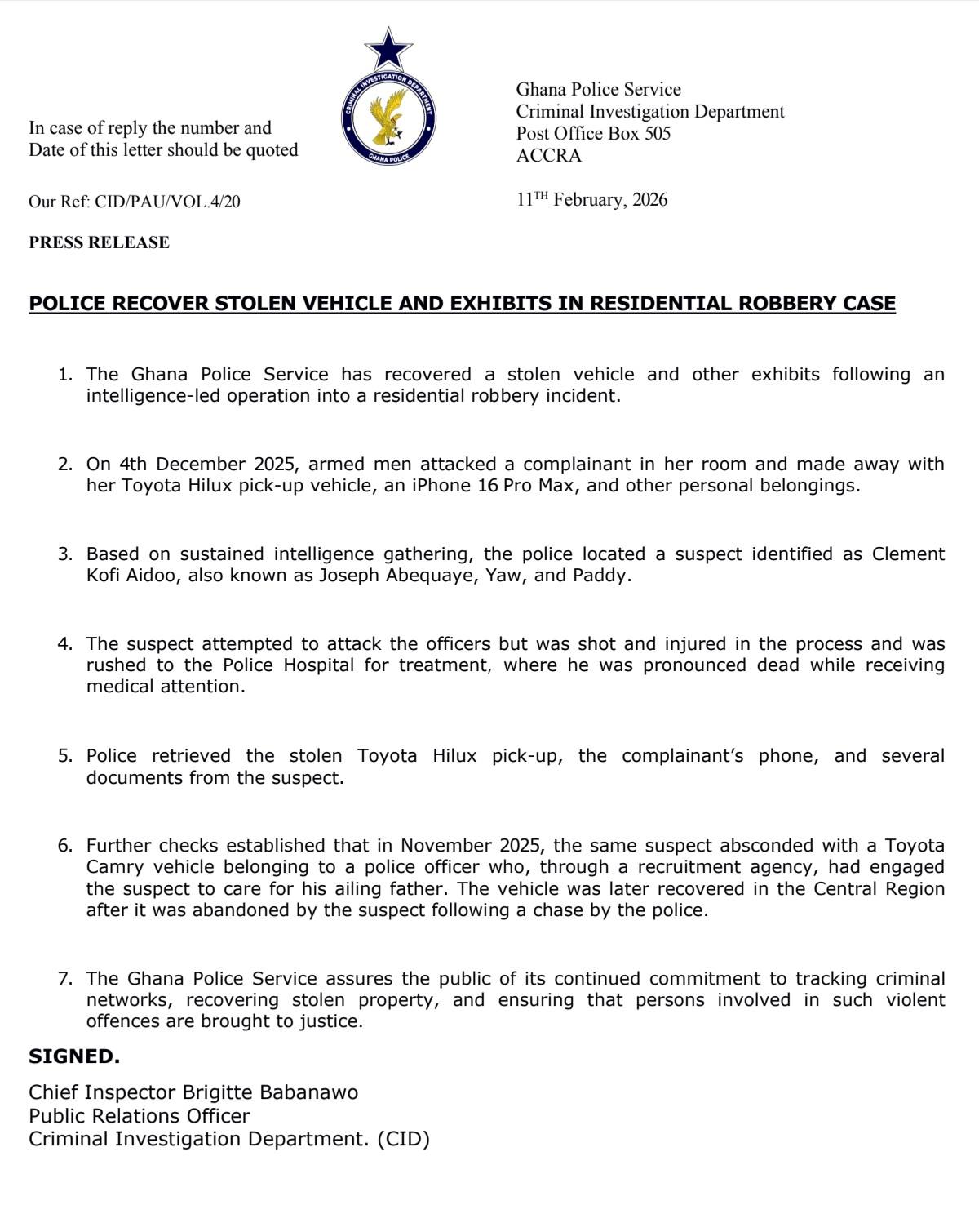 In a press release issued by the Criminal Investigation Department (CID) on February 11, 2026, police said the breakthrough follows investigations into an armed robbery that occurred on December 4, 2025.