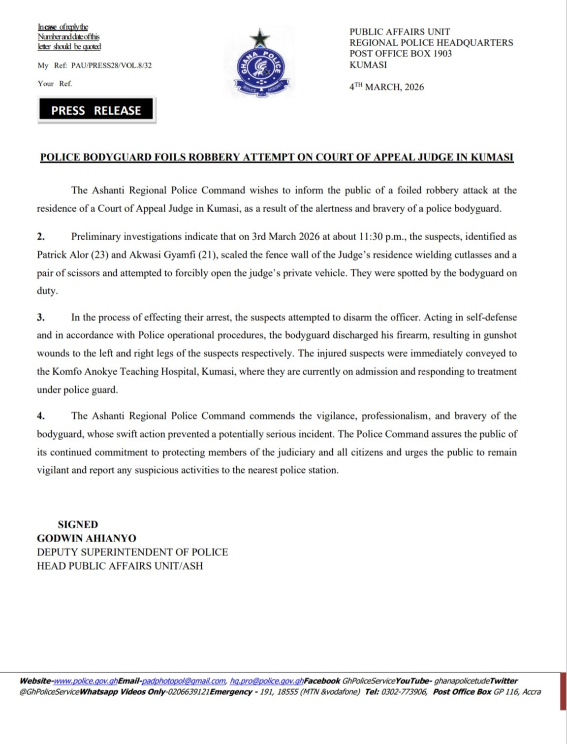 Both suspects were shot in the legs and were immediately arrested. They were taken under heavy police escort to the Komfo Anokye Teaching Hospital, where they are receiving treatment and are said to be in stable condition.
