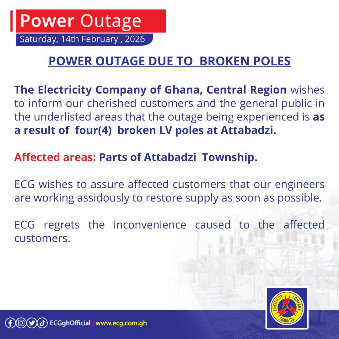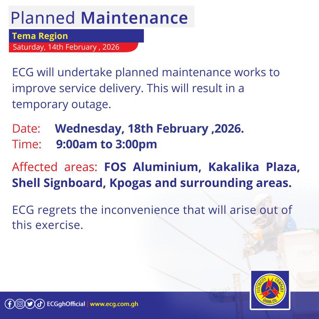 The Electricity Company of Ghana (ECG) has announced a series of planned maintenance exercises across parts of the country beginning Monday, February 16, 2026, warning customers to expect temporary power outages in affected communities.