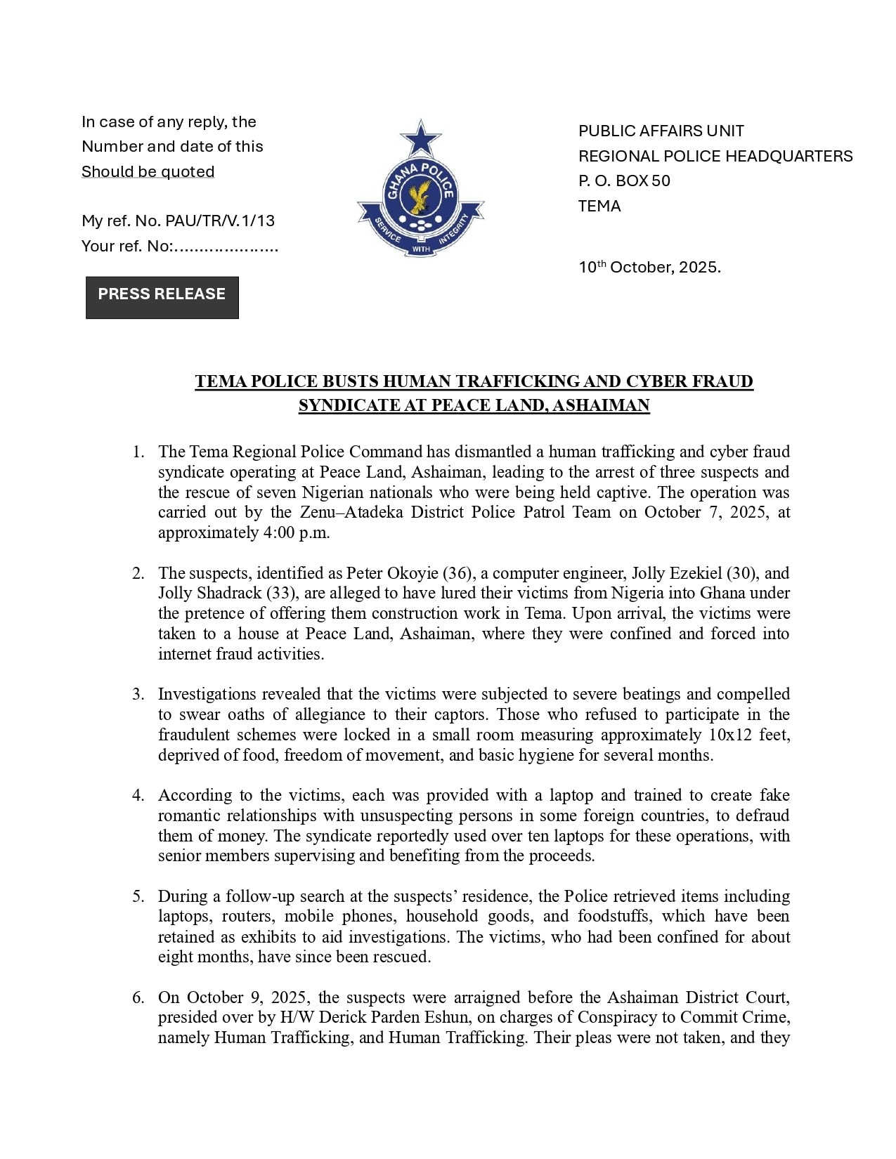 The Tema Regional Police Command has uncovered and dismantled a human trafficking and cyber fraud network operating at Peace Land in Ashaiman.