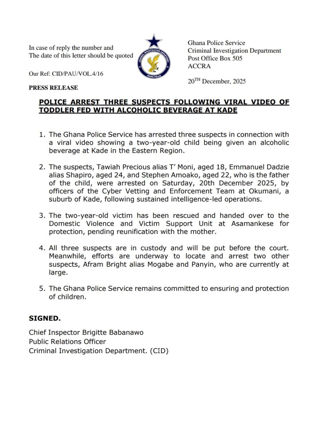 The Ghana Police Service has arrested three people in connection with a viral video showing a two-year-old child being fed with an alcoholic beverage at Kade in the Eastern Region.