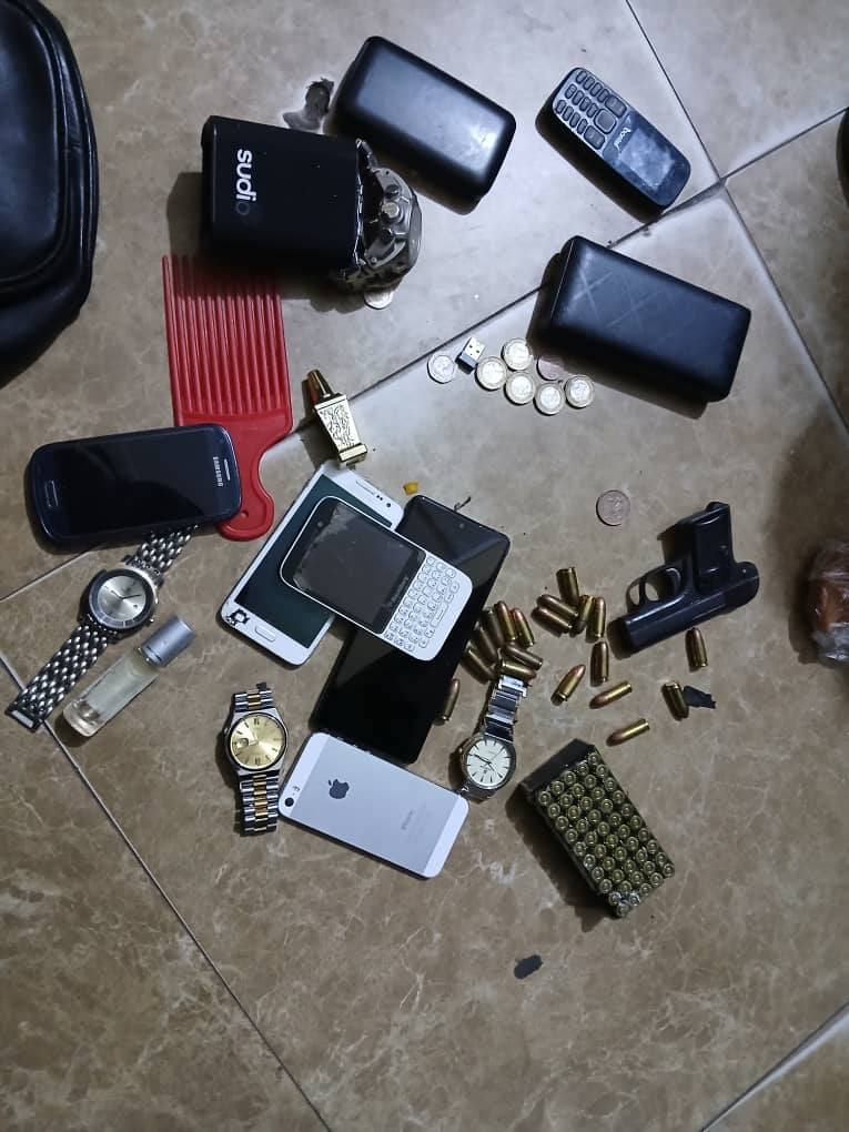 A search conducted on the suspects led to the retrieval of one pistol bearing the number 39363 with the inscription “CS HEAND SUH,” seventy-two rounds of ammunition, four mobile phones, an iPhone, an LG smartphone, a Blackberry phone and a keypad phone, as well as two wristwatches.