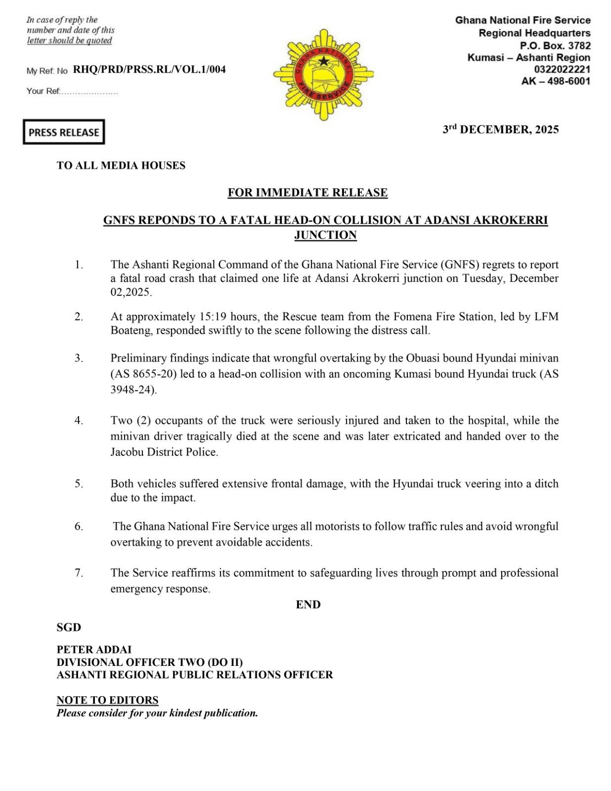 A rescue team from the Fomena Fire Station, led by LFM Boateng, extricated the deceased driver and handed the body over to police officers at the scene.