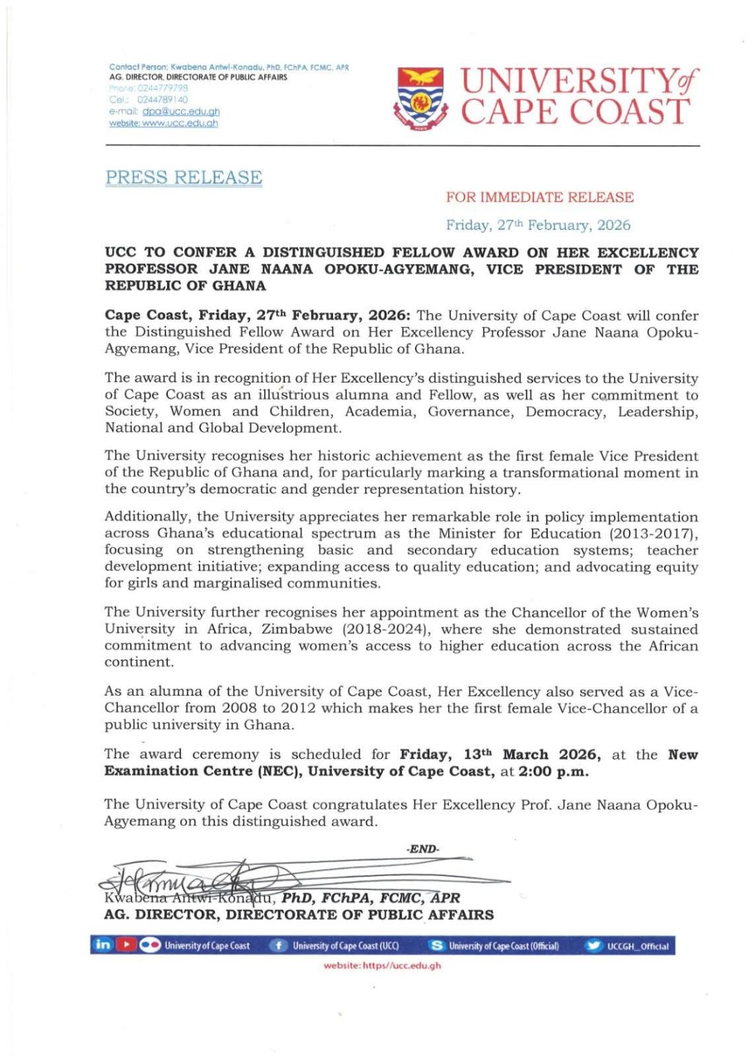 The University of Cape Coast (UCC) has announced plans to confer its prestigious Distinguished Fellow Award on Vice President Jane Naana Opoku-Agyemang in recognition of her outstanding contribution to education, leadership and national development.
