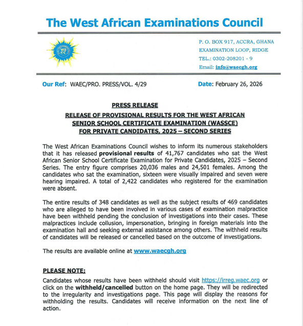 The West African Examinations Council (WAEC) has released the provisional results of candidates who sat for the 2025 West African Senior School Certificate Examination (WASSCE) for Private Candidates, Second Series.
