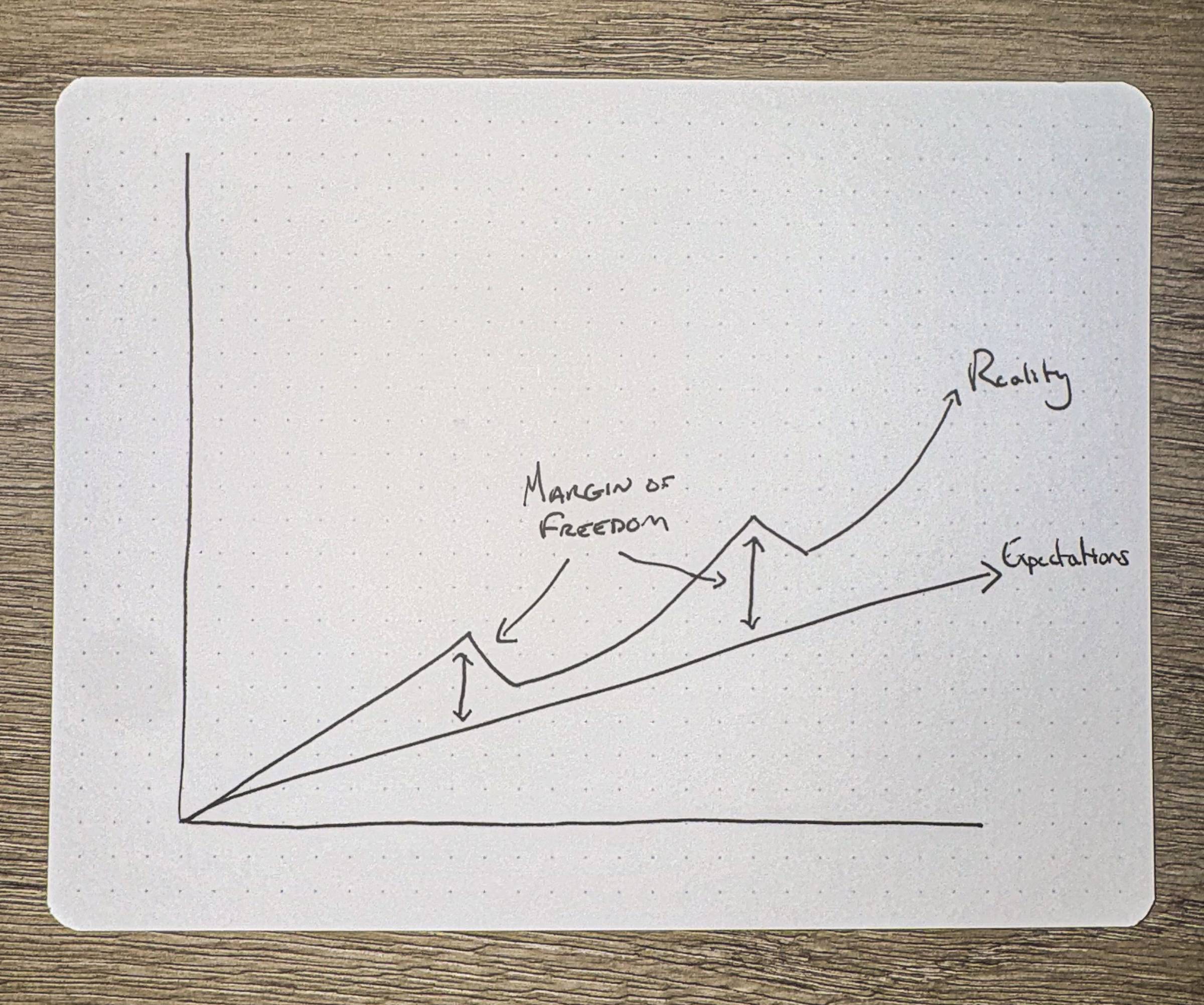 Your Margin of Freedom is the buffer you intentionally create between your reality and your expectations. Expectations are your single greatest financial liability. Your expectations for what you need to be happy will steadily increase if you don’t keep an eye on them. The changes are subtle enough that you won’t notice them in the days, but they’ll have a dramatic impact in the years.