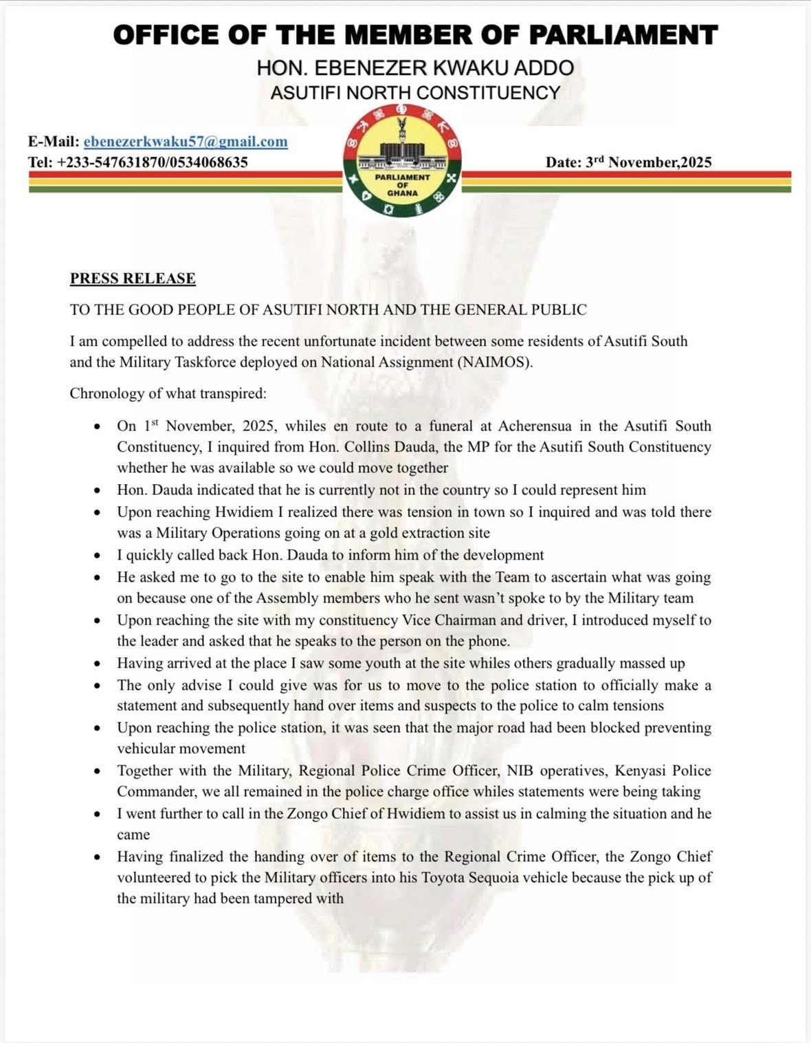 In a statement, Mr. Addo explained that the incident happened on November 1, 2025, while he was on his way to attend a funeral in Acherensua.