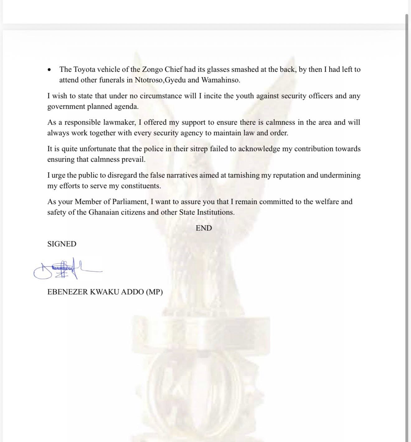 “I had already left to attend other funerals in Ntotroso, Gyedu, and Wamahinso by that time,” the MP said. “At no point did I incite the youth against security officers or government operations. I did everything I could to maintain peace.”