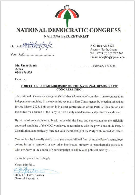 In a letter dated February 17, 2026, and signed by the party’s General Secretary, Fifi Fiavi Kwetey, the NDC said Umar Sanda’s decision to run independently is in direct breach of the party’s constitution.
