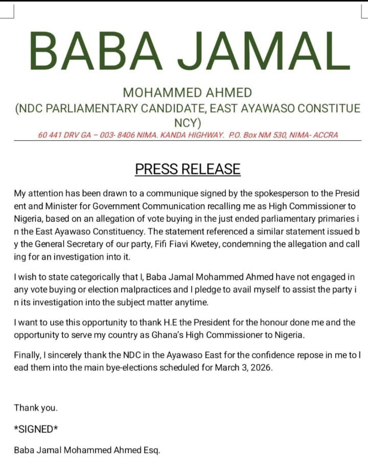 “My attention has been drawn to a communique recalling me as High Commissioner to Nigeria based on an allegation of vote buying in the just ended parliamentary primaries,” he stated. “I wish to state categorically that I, Baba Jamal Mohammed Ahmed, have not engaged in any vote buying or election malpractices, and I pledge to make myself available to assist the party in its investigations into the matter at any time.”