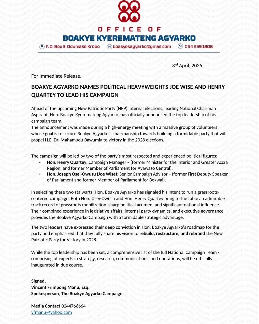 According to the statement, the appointments signal Agyarko’s intention to run a grassroots-focused campaign, leveraging the pair’s experience in political mobilization and party organization. The campaign team believes their combined expertise in legislative affairs and internal party dynamics will provide a strategic advantage.