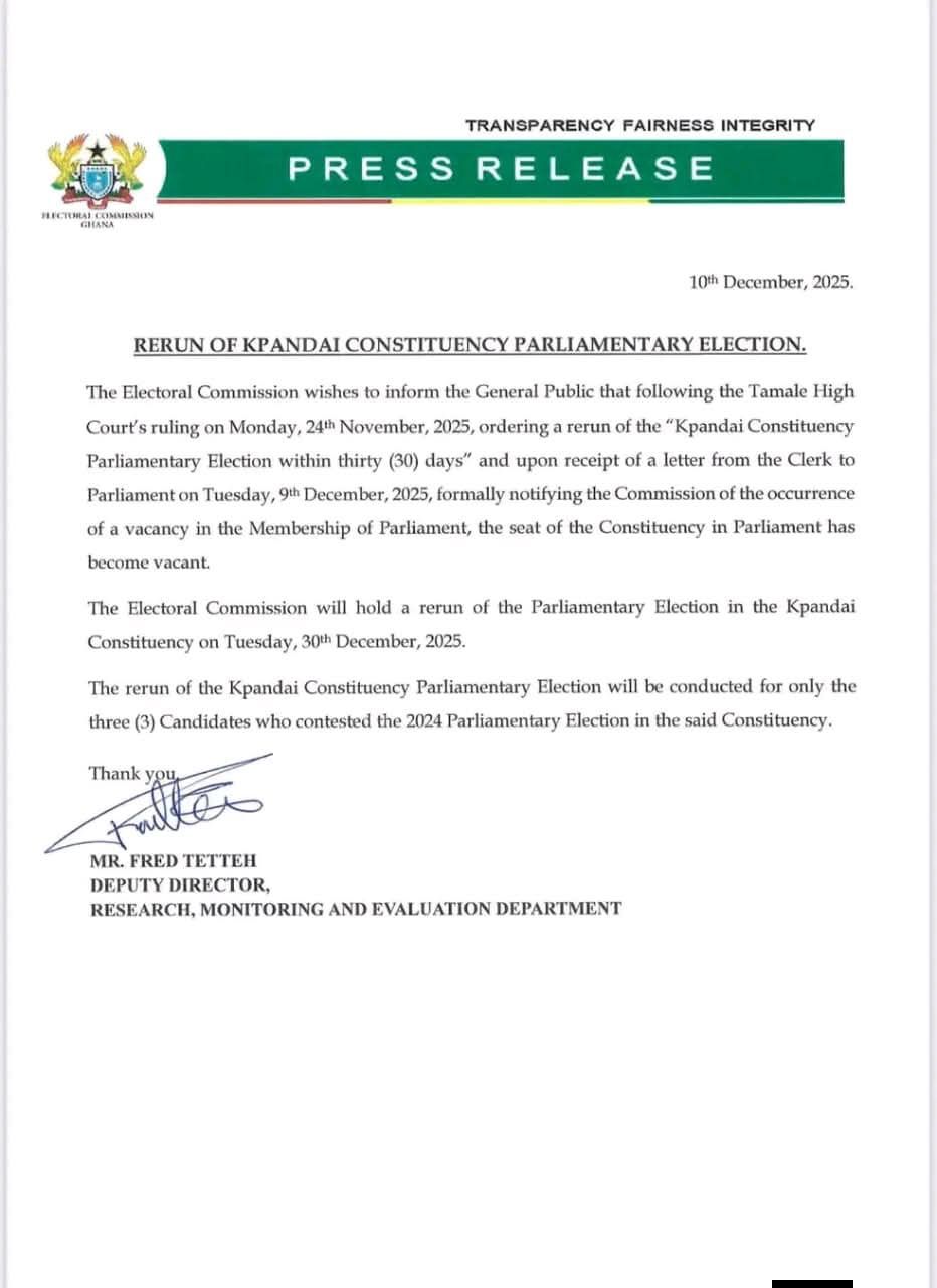 The Electoral Commission has announced that the Kpandai Constituency Parliamentary Election will be rerun on Tuesday, December 30, 2025.