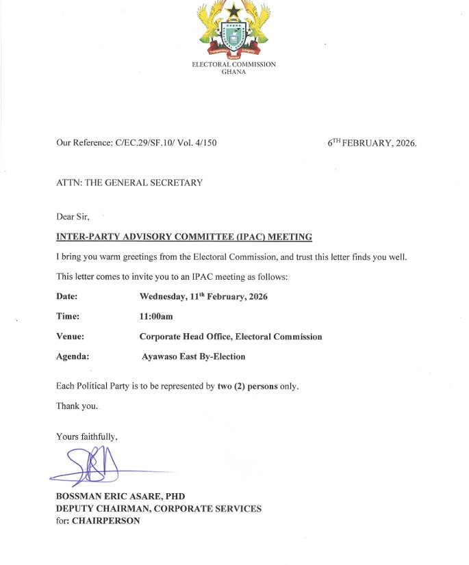 In a notice dated February 6, 2026, and addressed to the general secretaries of registered political parties, the Commission said the meeting will take place on Wednesday, February 11, 2026, at 11:00 a.m. at its corporate head office in Accra.