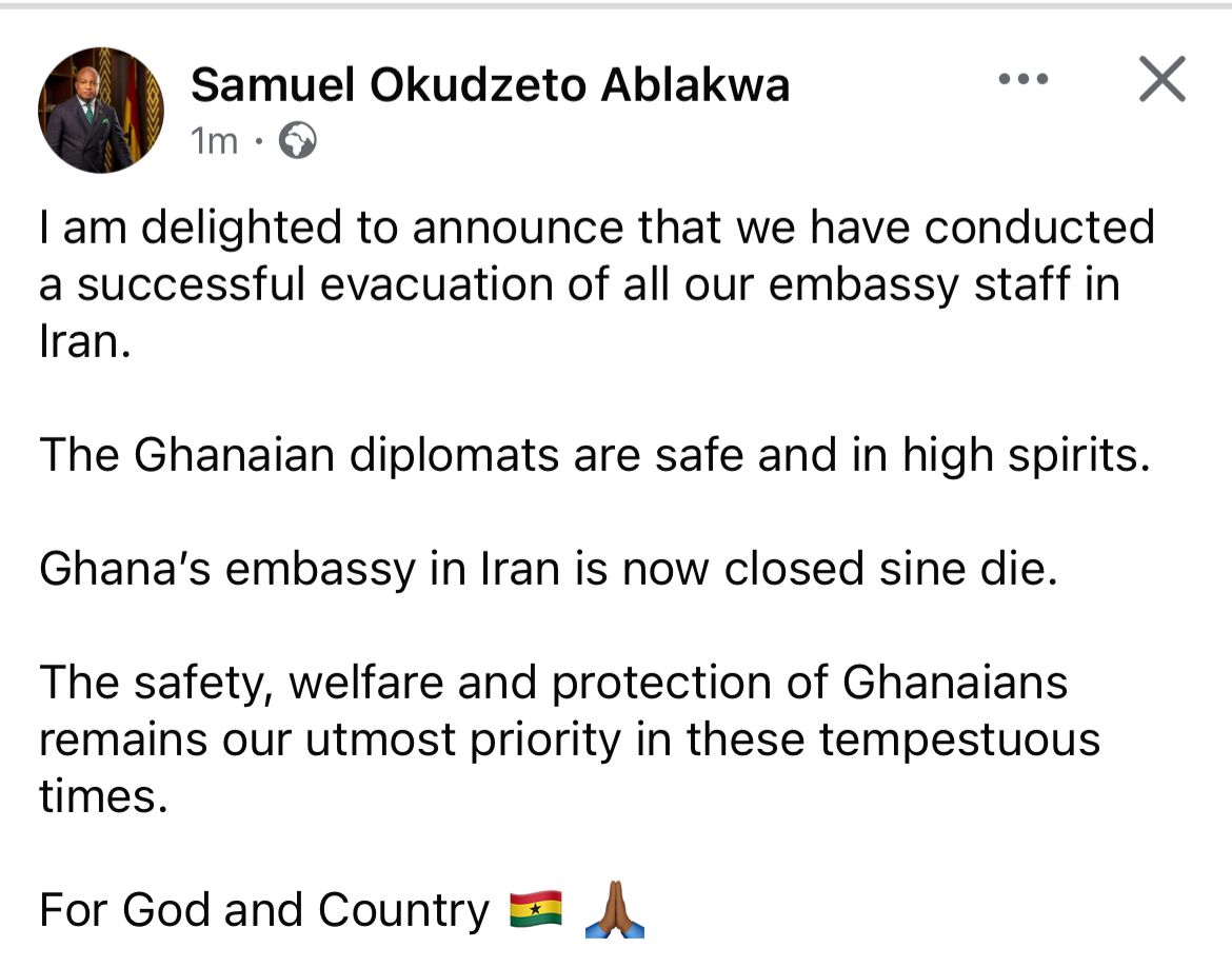 Foreign Affairs Minister, Samuel Okudzeto Ablakwa, has announced the successful evacuation of all Ghanaian embassy staff from Iran amid escalating security concerns in the country.